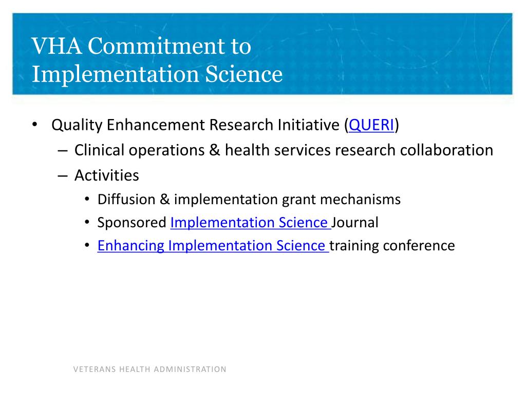 VHA Commitment to Implementation Science • Quality Enhancement Research Initiative (QUERI) • Clinical operations & health services research collaboration • Activities • Diffusion & implementation grant mechanisms • Sponsored Implementation Science Journal • Enhancing Implementation Science training conference