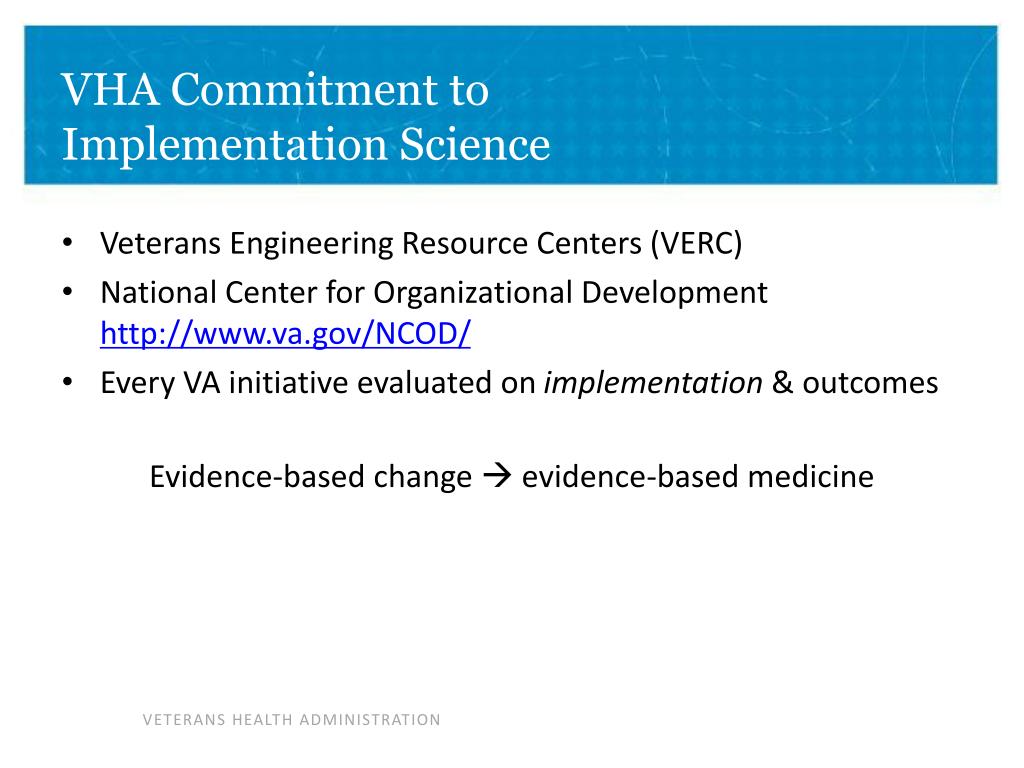 VHA Commitment to Implementation Science • Veterans Engineering Resource Centers (VERC) • National Center for Organizational Development http://www.va.gov/NCOD/ • Every VA initiative evaluated on implementation & outcomes Evidence-based change evidence-based medicine