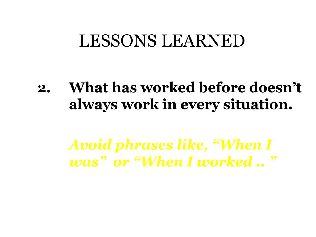 LESSONS LEARNED 2. What has worked before doesn’t always work in every situation. Avoid phrases like, “When I was” or “When I worked .. ”