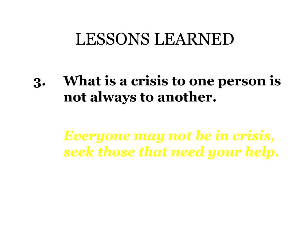 LESSONS LEARNED 3. What is a crisis to one person is not always to another. Everyone may not be in crisis, seek those that need your help.