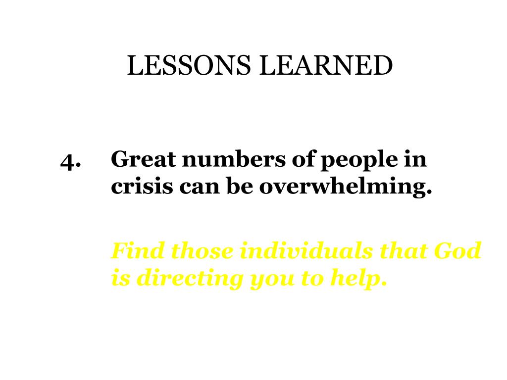 LESSONS LEARNED 4. Great numbers of people in crisis can be overwhelming. Find those individuals that God is directing you to help.