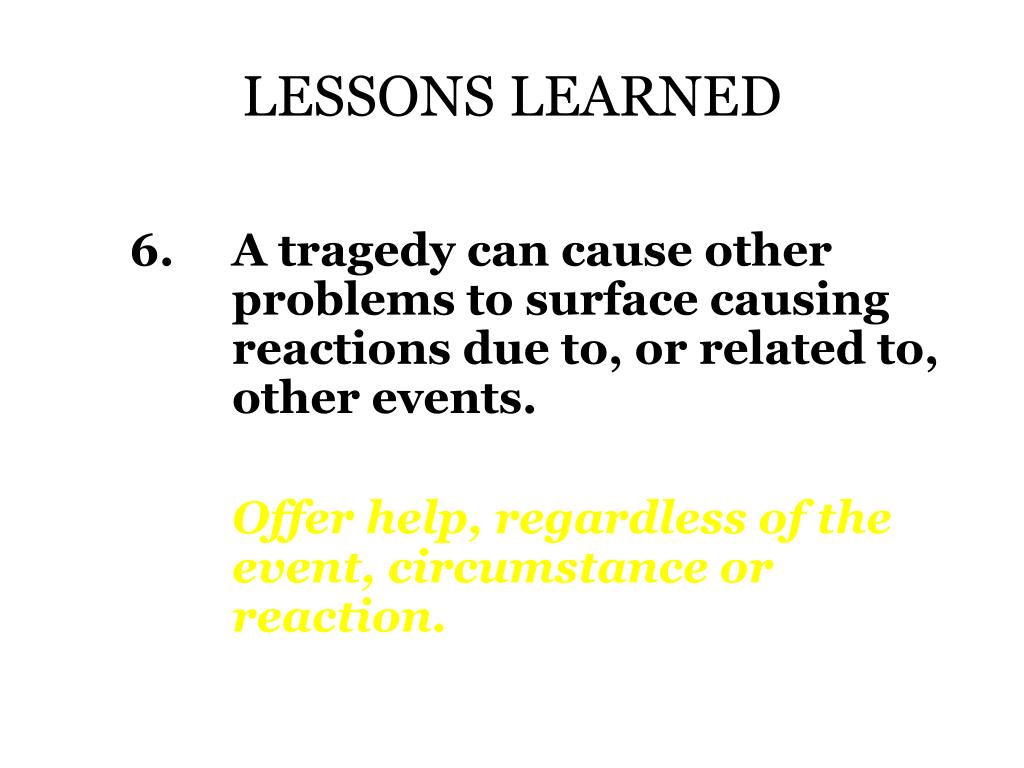 LESSONS LEARNED 6. A tragedy can cause other problems to surface causing reactions due to, or related to, other events. Offer help, regardless of the event, circumstance or reaction.