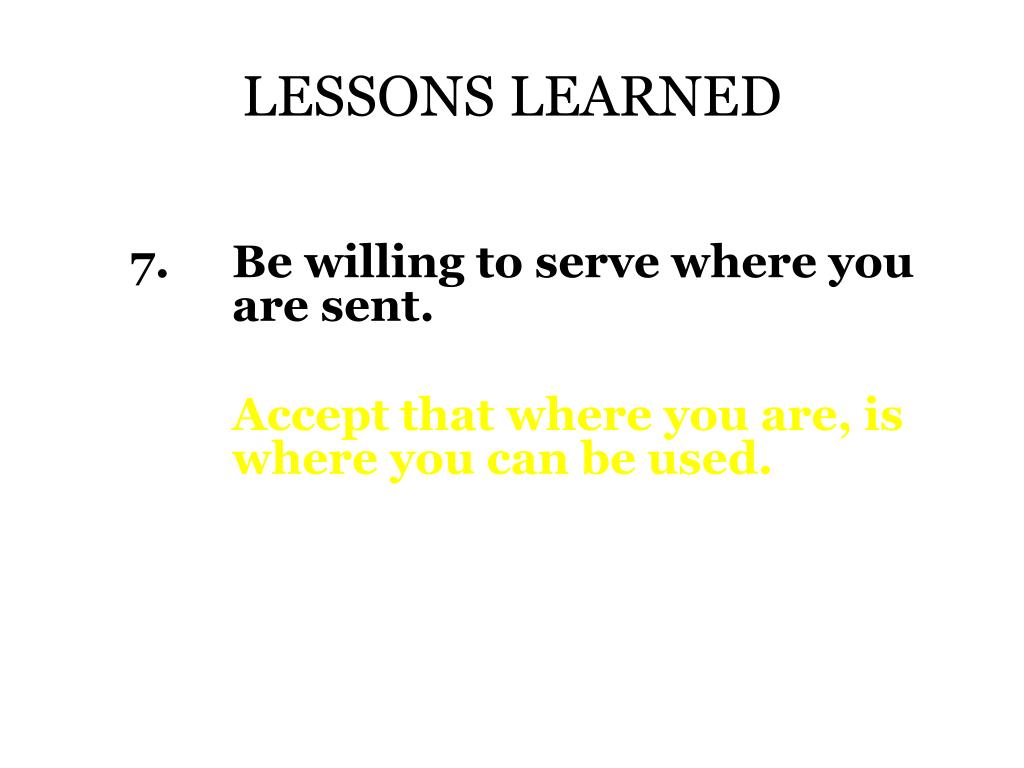 LESSONS LEARNED 7. Be willing to serve where you are sent. Accept that where you are, is where you can be used.