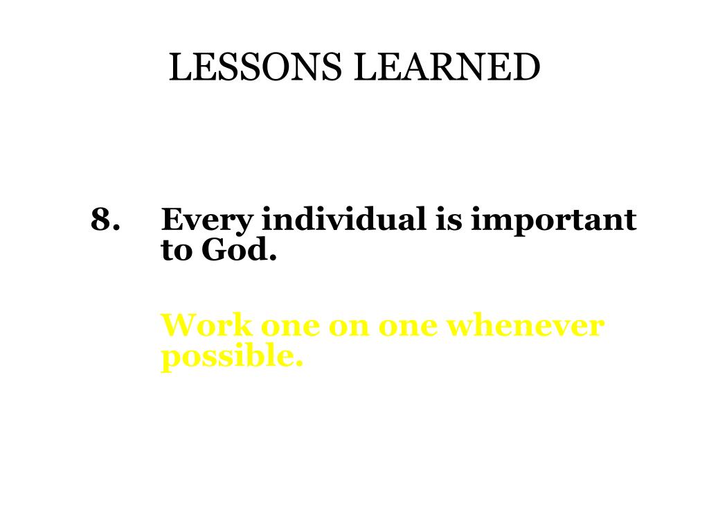 LESSONS LEARNED 8. Every individual is important to God. Work one on one whenever possible.