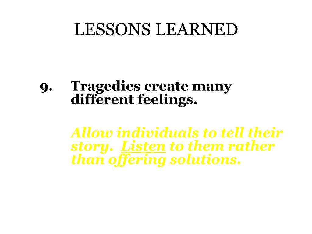 LESSONS LEARNED 9. Tragedies create many different feelings. Allow individuals to tell their story. Listen to them rather than offering solutions.