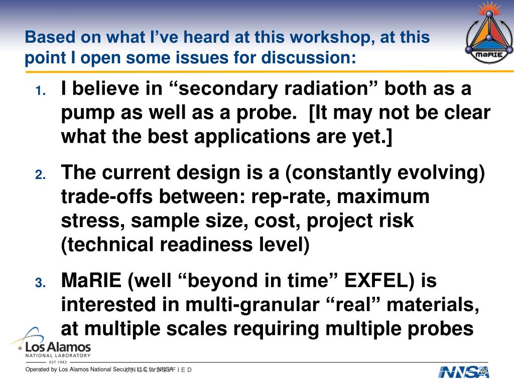 Based on what I’ve heard at this workshop, at this point I open some issues for discussion: • I believe in “secondary radiation” both as a pump as well as a probe. [It may not be clear what the best applications are yet.] • The current design is a (constantly evolving) trade-offs between: rep-rate, maximum stress, sample size, cost, project risk (technical readiness level) • MaRIE (well “beyond in time” EXFEL) is interested in multi-granular “real” materials, at multiple scales requiring multiple probes