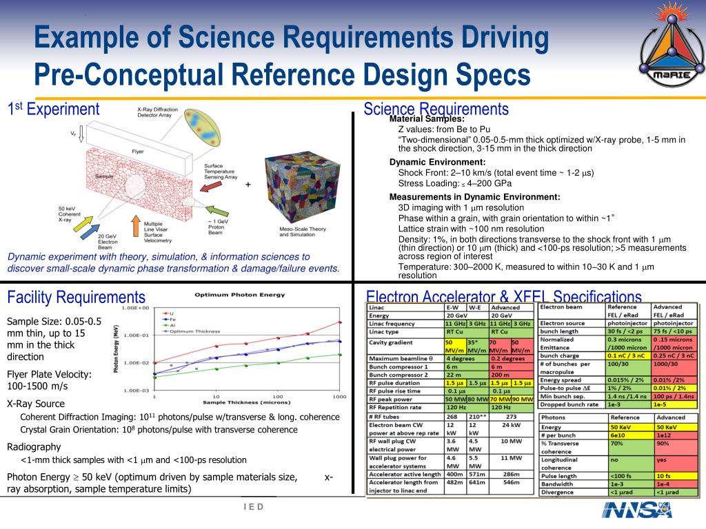 MaRIE science case forms the basis of a requirements-driven definition of the facility Preferred Alternative & Roadmap Alternatives Analyses Materiel Needs User Driven Science Functional Requirements Performance Gaps Facility Concept A Pre-Conceptual Design has been developed for optical lasers for MaRIE that meet the Functional Requirements that deliver the science case for a unique facility for In situ, dynamic measurements of real materialsin extreme environments coupled to directed synthesis via predictive theory
