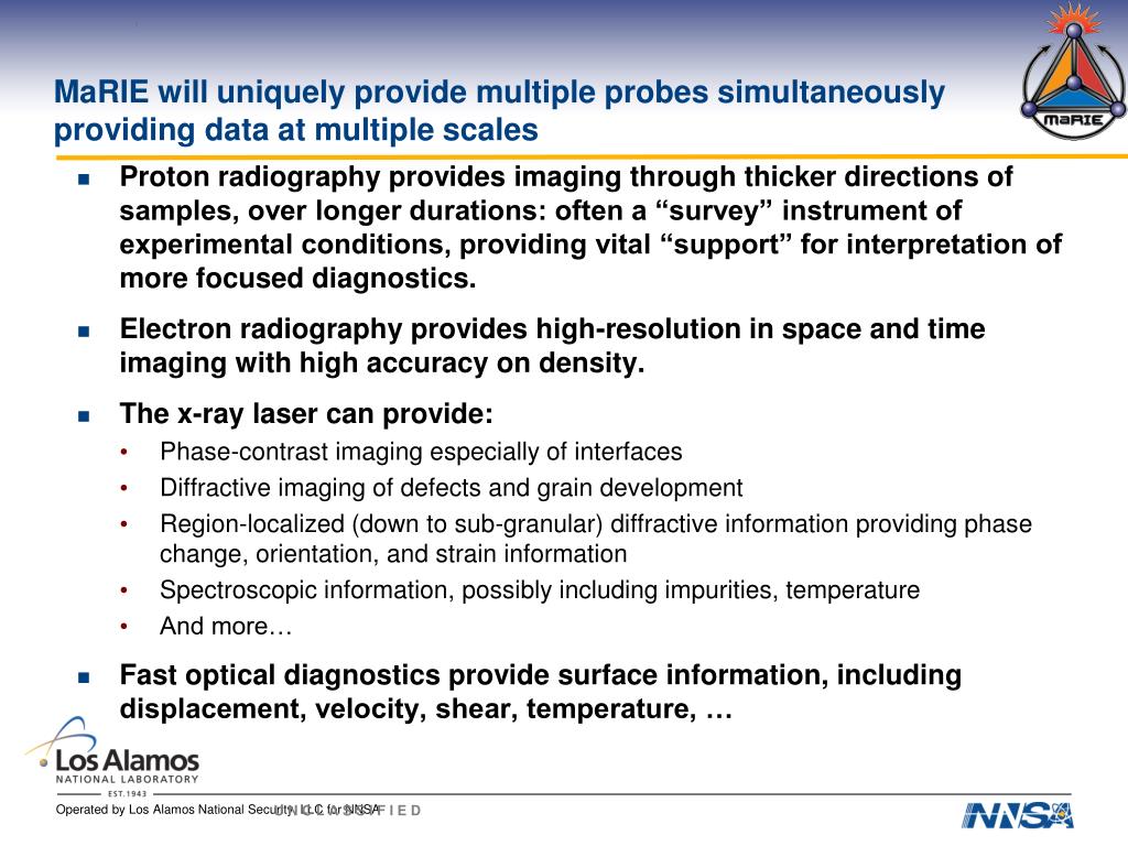 Acknowledgments • MaRIE Core team leads: John Sarrao, Don Rej, John Tapia, MichelineDevaurs, Mike Stevens, Rich Sheffield, John Erickson, TurabLookman, Mark Bourke, Mark McClesky, … • Laser requirements and design: John Benage, Juan Fernandez, Manuel Hegelich, Sam Letzring • Multi-Probe Diagnostic Hall Board of Directors, leadership and review committee: Mike Stevens, David Robbins, Dana Dattelbaum, Juan Fernandez, …