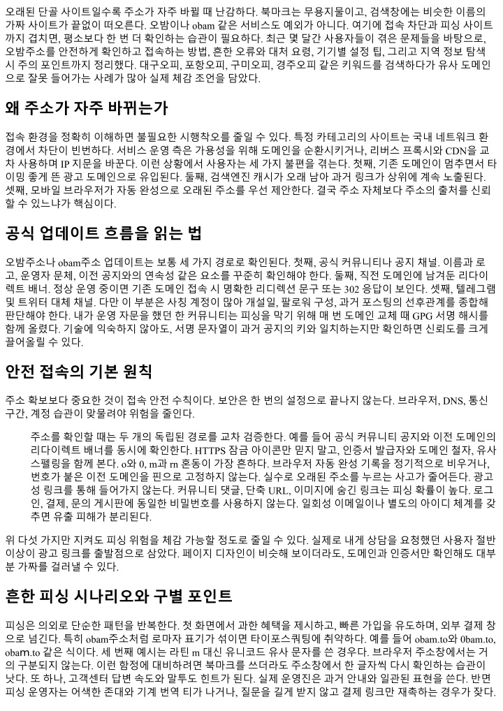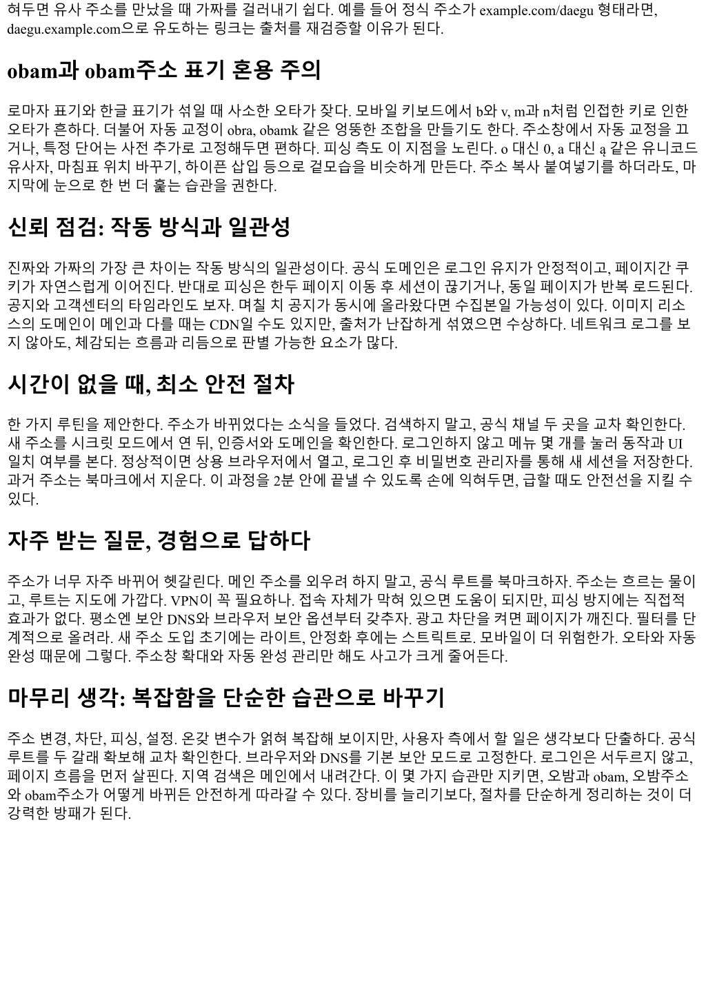 혀두면유사주소를만났을때가짜를걸러내기쉽다. 예를들어정식주소가 example.com/daegu 형태라면, daegu.example.com으로유도하는링크는출처를재검증할이유가된다. obam과 obam주소표기혼용주의 로마자표기와한글표기가섞일때사소한오타가잦다. 모바일키보드에서 b와 v, m과 n처럼인접한키로인한 오타가흔하다. 더불어자동교정이 obra, obamk 같은엉뚱한조합을만들기도한다. 주소창에서자동교정을끄 거나, 특정단어는사전추가로고정해두면편하다. 피싱측도이지점을노린다. o 대신 0, a 대신 ą 같은유니코드 유사자, 마침표위치바꾸기, 하이픈삽입등으로겉모습을비슷하게만든다. 주소복사붙여넣기를하더라도, 마 지막에눈으로한번더훑는습관을권한다. 신뢰점검: 작동방식과일관성 진짜와가짜의가장큰차이는작동방식의일관성이다. 공식도메인은로그인유지가안정적이고, 페이지간쿠 키가자연스럽게이어진다. 반대로피싱은한두페이지이동후세션이끊기거나, 동일페이지가반복로드된다. 공지와고객센터의타임라인도보자. 며칠치공지가동시에올라왔다면수집본일가능성이있다. 이미지리소 스의도메인이메인과다를때는 CDN일수도있지만, 출처가난잡하게섞였으면수상하다. 네트워크로그를보 지않아도, 체감되는흐름과리듬으로판별가능한요소가많다. 시간이없을때, 최소안전절차 한가지루틴을제안한다. 주소가바뀌었다는소식을들었다. 검색하지말고, 공식채널두곳을교차확인한다. 새주소를시크릿모드에서연뒤, 인증서와도메인을확인한다. 로그인하지않고메뉴몇개를눌러동작과 UI 일치여부를본다. 정상적이면상용브라우저에서열고, 로그인후비밀번호관리자를통해새세션을저장한다. 과거주소는북마크에서지운다. 이과정을 2분안에끝낼수있도록손에익혀두면, 급할때도안전선을지킬수 있다. 자주받는질문, 경험으로답하다 주소가너무자주바뀌어헷갈린다. 메인주소를외우려하지말고, 공식루트를북마크하자. 주소는흐르는물이 고, 루트는지도에가깝다. VPN이꼭필요하나. 접속자체가막혀있으면도움이되지만, 피싱방지에는직접적 효과가없다. 평소엔보안 DNS와브라우저보안옵션부터갖추자. 광고차단을켜면페이지가깨진다. 필터를단 계적으로올려라. 새주소도입초기에는라이트, 안정화후에는스트릭트로. 모바일이더위험한가. 오타와자동 완성때문에그렇다. 주소창확대와자동완성관리만해도사고가크게줄어든다. 마무리생각: 복잡함을단순한습관으로바꾸기 주소변경, 차단, 피싱, 설정. 온갖변수가얽혀복잡해보이지만, 사용자측에서할일은생각보다단출하다. 공식 루트를두갈래확보해교차확인한다. 브라우저와 DNS를기본보안모드로고정한다. 로그인은서두르지않고, 페이지흐름을먼저살핀다. 지역검색은메인에서내려간다. 이몇가지습관만지키면, 오밤과 obam, 오밤주소 와 obam주소가어떻게바뀌든안전하게따라갈수있다. 장비를늘리기보다, 절차를단순하게정리하는것이더 강력한방패가된다.