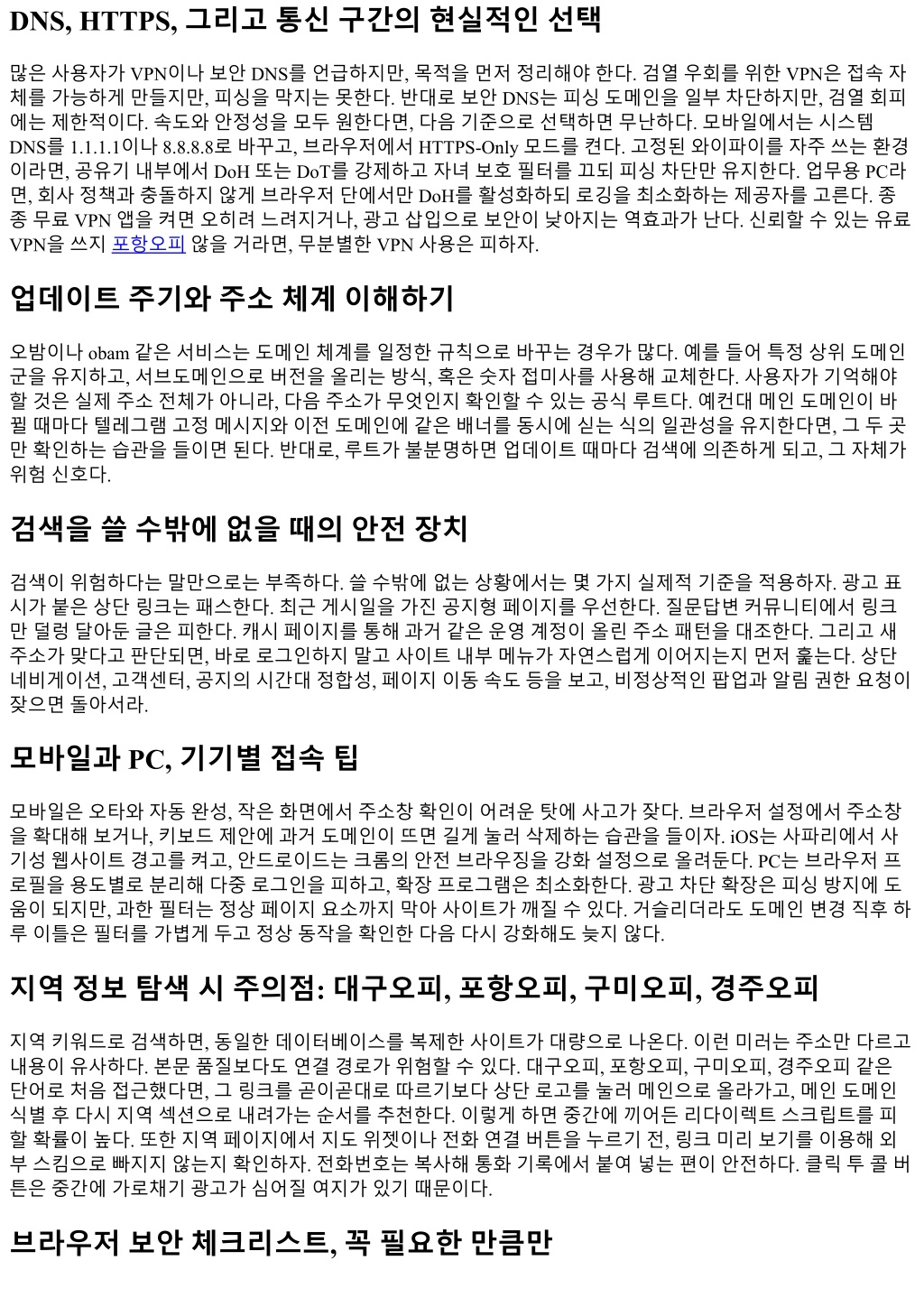 DNS, HTTPS, 그리고통신구간의현실적인선택 많은사용자가 VPN이나보안 DNS를언급하지만, 목적을먼저정리해야한다. 검열우회를위한 VPN은접속자 체를가능하게만들지만, 피싱을막지는못한다. 반대로보안 DNS는피싱도메인을일부차단하지만, 검열회피 에는제한적이다. 속도와안정성을모두원한다면, 다음기준으로선택하면무난하다. 모바일에서는시스템 DNS를 1.1.1.1이나 8.8.8.8로바꾸고, 브라우저에서 HTTPS-Only 모드를켠다. 고정된와이파이를자주쓰는환경 이라면, 공유기내부에서 DoH 또는 DoT를강제하고자녀보호필터를끄되피싱차단만유지한다. 업무용 PC라 면, 회사정책과충돌하지않게브라우저단에서만 DoH를활성화하되로깅을최소화하는제공자를고른다. 종 종무료 VPN 앱을켜면오히려느려지거나, 광고삽입으로보안이낮아지는역효과가난다. 신뢰할수있는유료 VPN을쓰지포항오피않을거라면, 무분별한 VPN 사용은피하자. 업데이트주기와주소체계이해하기 오밤이나 obam 같은서비스는도메인체계를일정한규칙으로바꾸는경우가많다. 예를들어특정상위도메인 군을유지하고, 서브도메인으로버전을올리는방식, 혹은숫자접미사를사용해교체한다. 사용자가기억해야 할것은실제주소전체가아니라, 다음주소가무엇인지확인할수있는공식루트다. 예컨대메인도메인이바 뀔때마다텔레그램고정메시지와이전도메인에같은배너를동시에싣는식의일관성을유지한다면, 그두곳 만확인하는습관을들이면된다. 반대로, 루트가불분명하면업데이트때마다검색에의존하게되고, 그자체가 위험신호다. 검색을쓸수밖에없을때의안전장치 검색이위험하다는말만으로는부족하다. 쓸수밖에없는상황에서는몇가지실제적기준을적용하자. 광고표 시가붙은상단링크는패스한다. 최근게시일을가진공지형페이지를우선한다. 질문답변커뮤니티에서링크 만덜렁달아둔글은피한다. 캐시페이지를통해과거같은운영계정이올린주소패턴을대조한다. 그리고새 주소가맞다고판단되면, 바로로그인하지말고사이트내부메뉴가자연스럽게이어지는지먼저훑는다. 상단 네비게이션, 고객센터, 공지의시간대정합성, 페이지이동속도등을보고, 비정상적인팝업과알림권한요청이 잦으면돌아서라. 모바일과 PC, 기기별접속팁 모바일은오타와자동완성, 작은화면에서주소창확인이어려운탓에사고가잦다. 브라우저설정에서주소창 을확대해보거나, 키보드제안에과거도메인이뜨면길게눌러삭제하는습관을들이자. iOS는사파리에서사 기성웹사이트경고를켜고, 안드로이드는크롬의안전브라우징을강화설정으로올려둔다. PC는브라우저프 로필을용도별로분리해다중로그인을피하고, 확장프로그램은최소화한다. 광고차단확장은피싱방지에도 움이되지만, 과한필터는정상페이지요소까지막아사이트가깨질수있다. 거슬리더라도도메인변경직후하 루이틀은필터를가볍게두고정상동작을확인한다음다시강화해도늦지않다. 지역정보탐색시주의점: 대구오피, 포항오피, 구미오피, 경주오피 지역키워드로검색하면, 동일한데이터베이스를복제한사이트가대량으로나온다. 이런미러는주소만다르고 내용이유사하다. 본문품질보다도연결경로가위험할수있다. 대구오피, 포항오피, 구미오피, 경주오피같은 단어로처음접근했다면, 그링크를곧이곧대로따르기보다상단로고를눌러메인으로올라가고, 메인도메인 식별후다시지역섹션으로내려가는순서를추천한다. 이렇게하면중간에끼어든리다이렉트스크립트를피 할확률이높다. 또한지역페이지에서지도위젯이나전화연결버튼을누르기전, 링크미리보기를이용해외 부스킴으로빠지지않는지확인하자. 전화번호는복사해통화기록에서붙여넣는편이안전하다. 클릭투콜버 튼은중간에가로채기광고가심어질여지가있기때문이다. 브라우저보안체크리스트, 꼭필요한만큼만