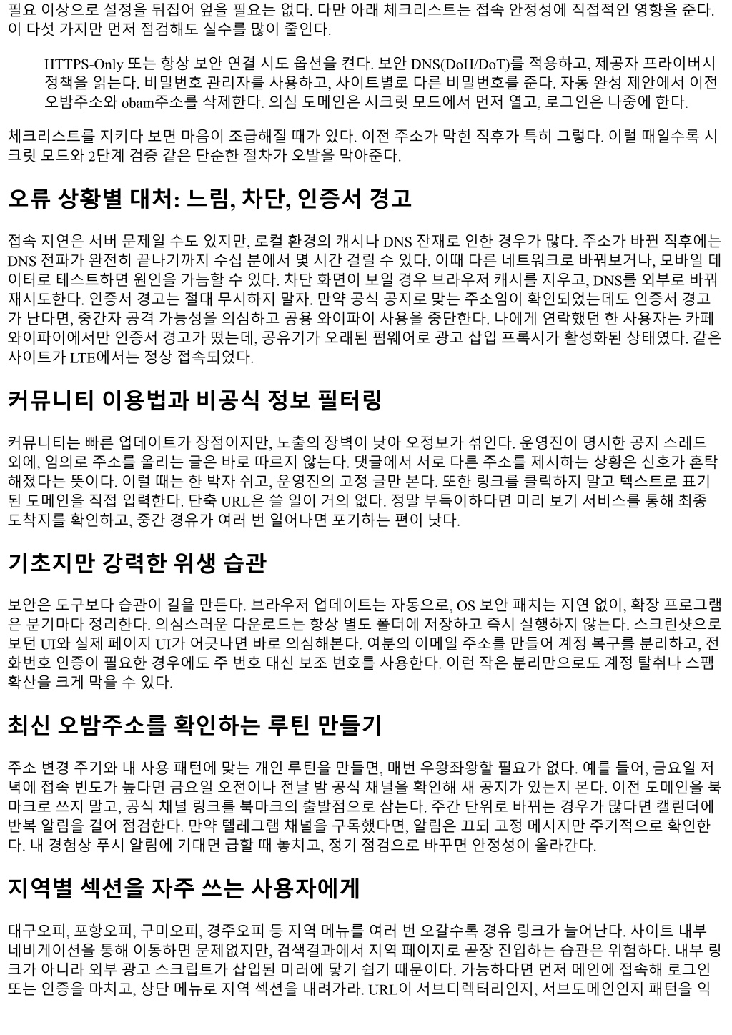 필요이상으로설정을뒤집어엎을필요는없다. 다만아래체크리스트는접속안정성에직접적인영향을준다. 이다섯가지만먼저점검해도실수를많이줄인다. HTTPS-Only 또는항상보안연결시도옵션을켠다. 보안 DNS(DoH/DoT)를적용하고, 제공자프라이버시 정책을읽는다. 비밀번호관리자를사용하고, 사이트별로다른비밀번호를준다. 자동완성제안에서이전 오밤주소와 obam주소를삭제한다. 의심도메인은시크릿모드에서먼저열고, 로그인은나중에한다. 체크리스트를지키다보면마음이조급해질때가있다. 이전주소가막힌직후가특히그렇다. 이럴때일수록시 크릿모드와 2단계검증같은단순한절차가오발을막아준다. 오류상황별대처: 느림, 차단, 인증서경고 접속지연은서버문제일수도있지만, 로컬환경의캐시나 DNS 잔재로인한경우가많다. 주소가바뀐직후에는 DNS 전파가완전히끝나기까지수십분에서몇시간걸릴수있다. 이때다른네트워크로바꿔보거나, 모바일데 이터로테스트하면원인을가늠할수있다. 차단화면이보일경우브라우저캐시를지우고, DNS를외부로바꿔 재시도한다. 인증서경고는절대무시하지말자. 만약공식공지로맞는주소임이확인되었는데도인증서경고 가난다면, 중간자공격가능성을의심하고공용와이파이사용을중단한다. 나에게연락했던한사용자는카페 와이파이에서만인증서경고가떴는데, 공유기가오래된펌웨어로광고삽입프록시가활성화된상태였다. 같은 사이트가 LTE에서는정상접속되었다. 커뮤니티이용법과비공식정보필터링 커뮤니티는빠른업데이트가장점이지만, 노출의장벽이낮아오정보가섞인다. 운영진이명시한공지스레드 외에, 임의로주소를올리는글은바로따르지않는다. 댓글에서서로다른주소를제시하는상황은신호가혼탁 해졌다는뜻이다. 이럴때는한박자쉬고, 운영진의고정글만본다. 또한링크를클릭하지말고텍스트로표기 된도메인을직접입력한다. 단축 URL은쓸일이거의없다. 정말부득이하다면미리보기서비스를통해최종 도착지를확인하고, 중간경유가여러번일어나면포기하는편이낫다. 기초지만강력한위생습관 보안은도구보다습관이길을만든다. 브라우저업데이트는자동으로, OS 보안패치는지연없이, 확장프로그램 은분기마다정리한다. 의심스러운다운로드는항상별도폴더에저장하고즉시실행하지않는다. 스크린샷으로 보던 UI와실제페이지 UI가어긋나면바로의심해본다. 여분의이메일주소를만들어계정복구를분리하고, 전 화번호인증이필요한경우에도주번호대신보조번호를사용한다. 이런작은분리만으로도계정탈취나스팸 확산을크게막을수있다. 최신오밤주소를확인하는루틴만들기 주소변경주기와내사용패턴에맞는개인루틴을만들면, 매번우왕좌왕할필요가없다. 예를들어, 금요일저 녁에접속빈도가높다면금요일오전이나전날밤공식채널을확인해새공지가있는지본다. 이전도메인을북 마크로쓰지말고, 공식채널링크를북마크의출발점으로삼는다. 주간단위로바뀌는경우가많다면캘린더에 반복알림을걸어점검한다. 만약텔레그램채널을구독했다면, 알림은끄되고정메시지만주기적으로확인한 다. 내경험상푸시알림에기대면급할때놓치고, 정기점검으로바꾸면안정성이올라간다. 지역별섹션을자주쓰는사용자에게 대구오피, 포항오피, 구미오피, 경주오피등지역메뉴를여러번오갈수록경유링크가늘어난다. 사이트내부 네비게이션을통해이동하면문제없지만, 검색결과에서지역페이지로곧장진입하는습관은위험하다. 내부링 크가아니라외부광고스크립트가삽입된미러에닿기쉽기때문이다. 가능하다면먼저메인에접속해로그인 또는인증을마치고, 상단메뉴로지역섹션을내려가라. URL이서브디렉터리인지, 서브도메인인지패턴을익