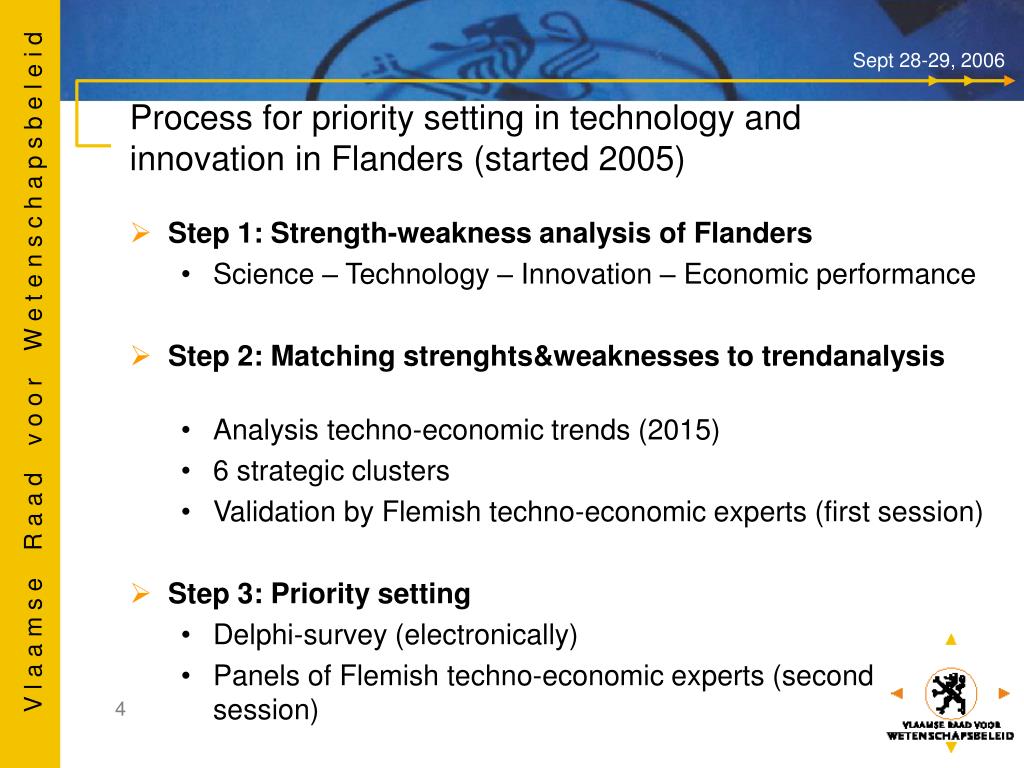 Process for priority setting in technology and innovation in Flanders (started 2005) • Step 1: Strength-weakness analysis of Flanders • Science – Technology – Innovation – Economic performance • Step 2: Matching strenghts&weaknesses to trendanalysis • Analysis techno-economic trends (2015) • 6 strategic clusters • Validation by Flemish techno-economic experts (first session) • Step 3: Priority setting • Delphi-survey (electronically) • Panels of Flemish techno-economic experts (second session)