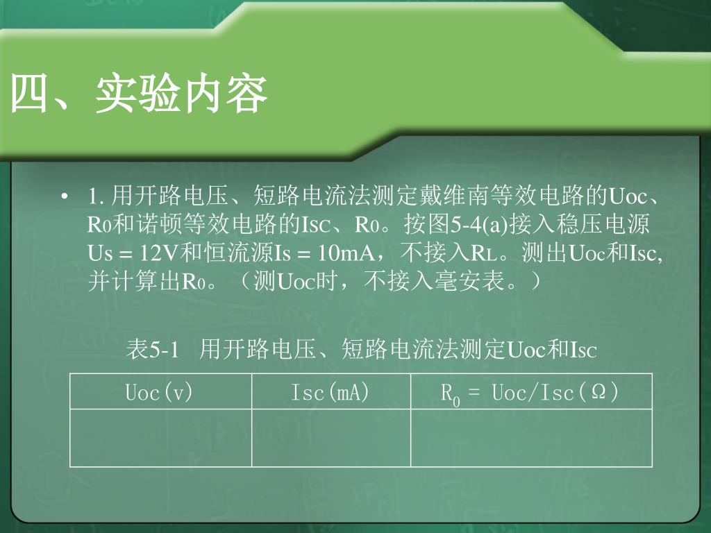 四、实验内容 • 1. 用开路电压、短路电流法测定戴维南等效电路的Uoc、R0和诺顿等效电路的ISC、R0。按图5-4(a)接入稳压电源Us = 12V和恒流源Is = 10mA,不接入RL。测出UOc和Isc,并计算出R0。(测UOC时,不接入毫安表。) 表5-1 用开路电压、短路电流法测定Uoc和ISC