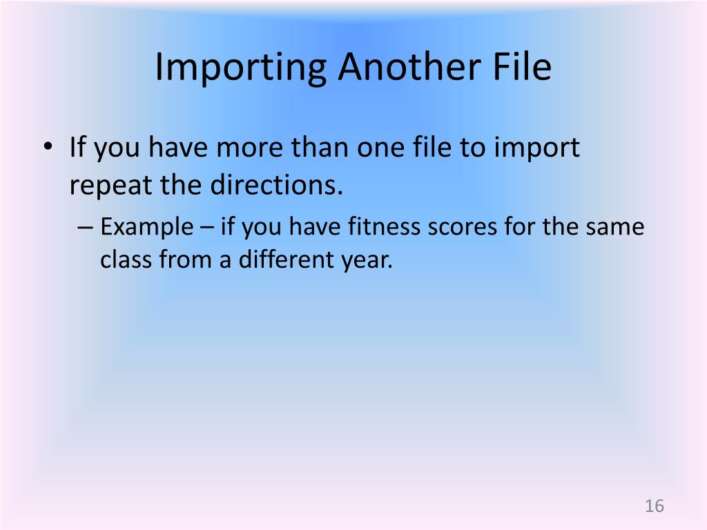 Importing Another File • If you have more than one file to import repeat the directions. • Example – if you have fitness scores for the same class from a different year.