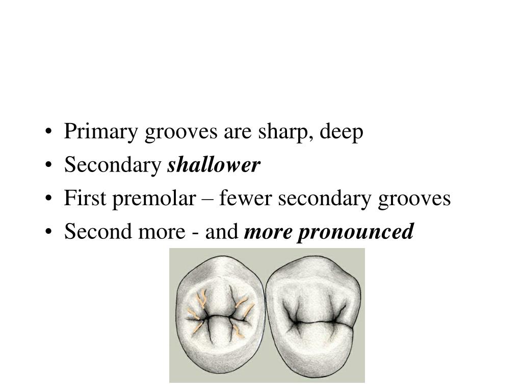 Primary grooves are sharp, deep • Secondary shallower • First premolar – fewer secondary grooves • Second more - and more pronounced