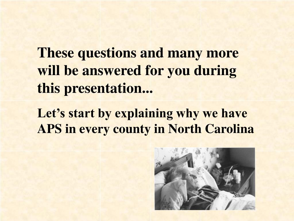 These questions and many more will be answered for you during this presentation... Let’s start by explaining why we have APS in every county in North Carolina