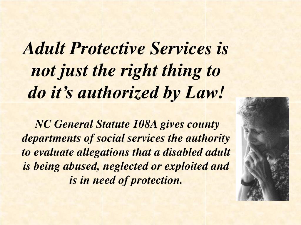 Adult Protective Services is not just the right thing to do it’s authorized by Law! NC General Statute 108A gives county departments of social services the authority to evaluate allegations that a disabled adult is being abused, neglected or exploited and is in need of protection.