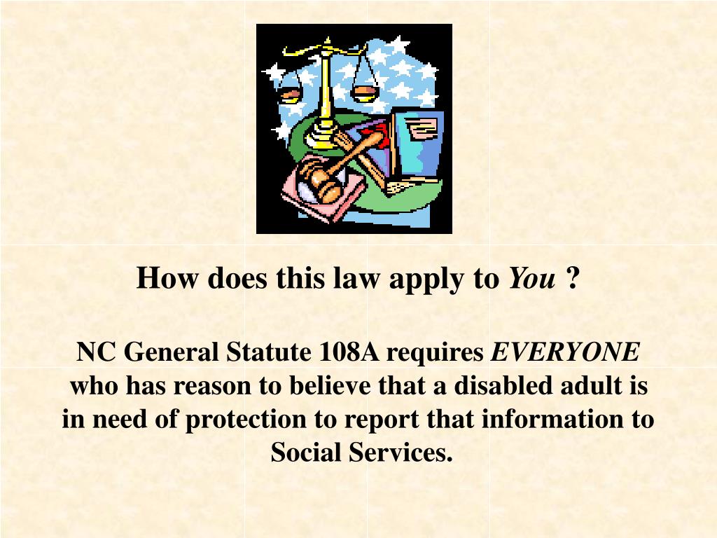 How does this law apply to You ? NC General Statute 108A requires EVERYONE who has reason to believe that a disabled adult is in need of protection to report that information to Social Services.