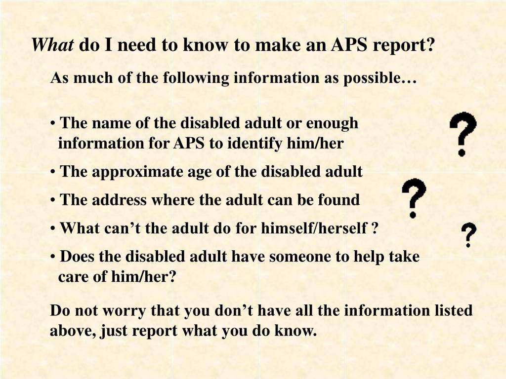 What do I need to know to make an APS report? As much of the following information as possible… • The name of the disabled adult or enough information for APS to identify him/her • The approximate age of the disabled adult • The address where the adult can be found • What can’t the adult do for himself/herself ? • Does the disabled adult have someone to help take care of him/her? Do not worry that you don’t have all the information listed above, just report what you do know.