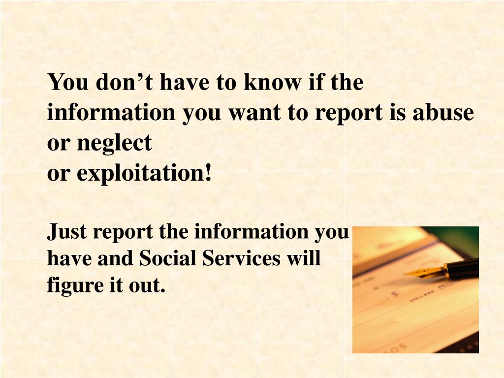 You don’t have to know if the information you want to report is abuse or neglect or exploitation! Just report the information you have and Social Services will figure it out.