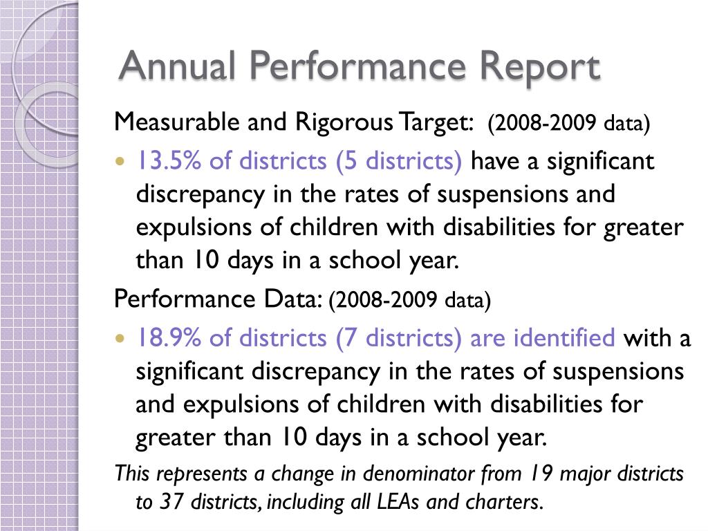 Annual Performance Report Measurable and Rigorous Target: (2008-2009 data) • 13.5% of districts (5 districts) have a significant discrepancy in the rates of suspensions and expulsions of children with disabilities for greater than 10 days in a school year. Performance Data: (2008-2009 data) • 18.9% of districts (7 districts) are identified with a significant discrepancy in the rates of suspensions and expulsions of children with disabilities for greater than 10 days in a school year. This represents a change in denominator from 19 major districts to 37 districts, including all LEAs and charters.