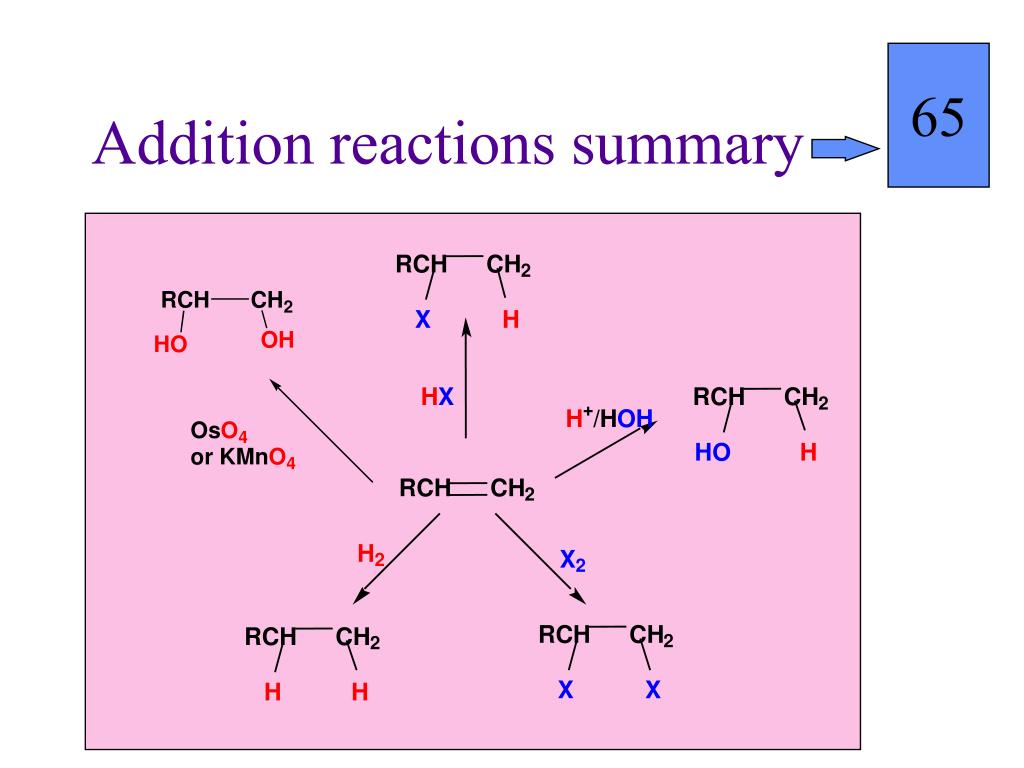 CH 2 H X RCH CH 2 + H /H OH HO H CH 2 H X 2 2 RCH CH RCH CH 2 2 X X H H 65 Addition reactions summary RCH X H RCH