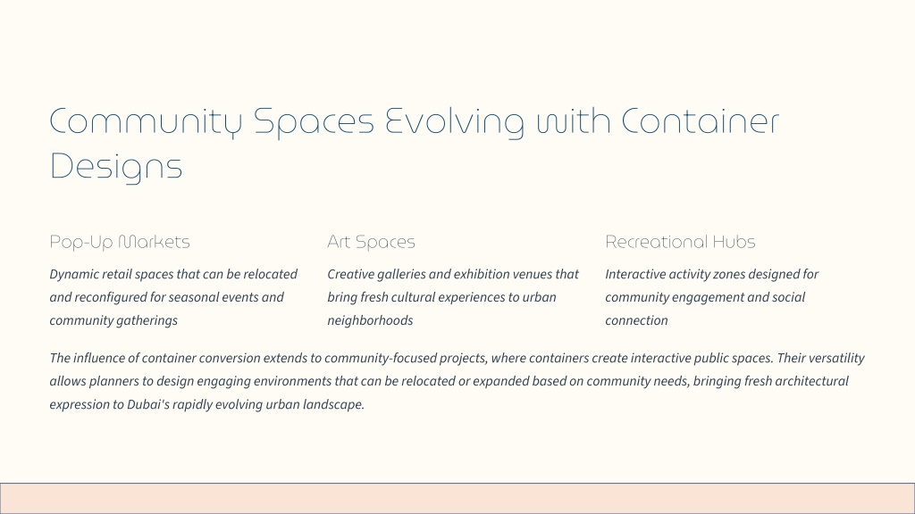 Community Spaces Evolving with Container Designs Pop-Up Markets Art Spaces Recreational Hubs Dynamic retail spaces that can be relocated and reconfigured for seasonal events and community gatherings Creative galleries and exhibition venues that bring fresh cultural experiences to urban neighborhoods Interactive activity zones designed for community engagement and social connection The influence of container conversion extends to community-focused projects, where containers create interactive public spaces. Their versatility allows planners to design engaging environments that can be relocated or expanded based on community needs, bringing fresh architectural expression to Dubai's rapidly evolving urban landscape.