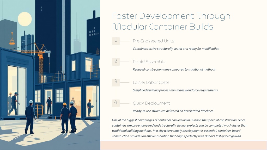 Faster Development Through Modular Container Builds 1 Pre-Engineered Units Containers arrive structurally sound and ready for modification 2 Rapid Assembly Reduced construction time compared to traditional methods 3 Lower Labor Costs Simplified building process minimizes workforce requirements 4 Quick Deployment Ready-to-use structures delivered on accelerated timelines One of the biggest advantages of container conversion in Dubai is the speed of construction. Since containers are pre-engineered and structurally strong, projects can be completed much faster than traditional building methods. In a city where timely development is essential, container-based construction provides an efficient solution that aligns perfectly with Dubai's fast-paced growth.
