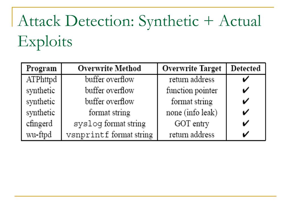 Attacks Detected by TaintCheck • Overwrite attack • jump targets (such as return addresses, function pointers, and function pointer offsets), whether altered to point to existing code (existing code attack) or injected code (code injection attack) • Format string attacks • an attacker provides a malicious format string to trick the program into leaking data or into writing an attacker-chosen value to an attacker-chosen memory address. • E.g., use of %n, %s and %x format tokens