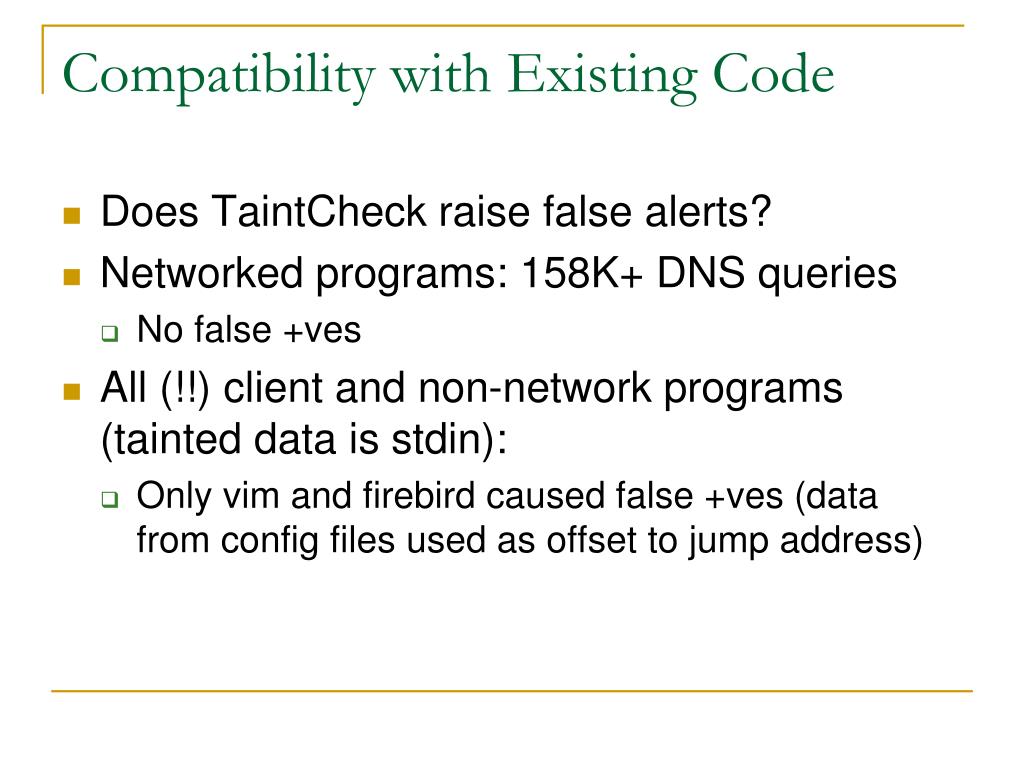 Compatibility with Existing Code • Does TaintCheck raise false alerts? • Networked programs: 158K+ DNS queries • No false +ves • All (!!) client and non-network programs (tainted data is stdin): • Only vim and firebird caused false +ves (data from config files used as offset to jump address)