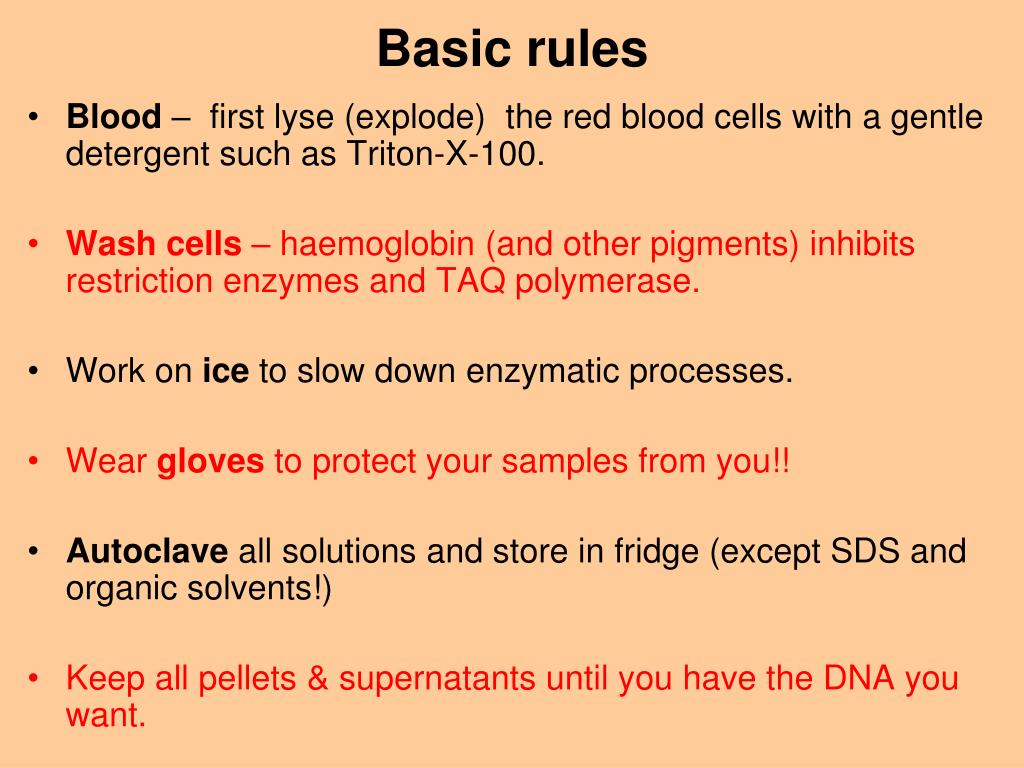 Basic rules • Blood – first lyse (explode) the red blood cells with a gentle detergent such as Triton-X-100. • Wash cells – haemoglobin (and other pigments) inhibits restriction enzymes and TAQ polymerase. • Work on ice to slow down enzymatic processes. • Wear gloves to protect your samples from you!! • Autoclave all solutions and store in fridge (except SDS and organic solvents!) • Keep all pellets & supernatants until you have the DNA you want.
