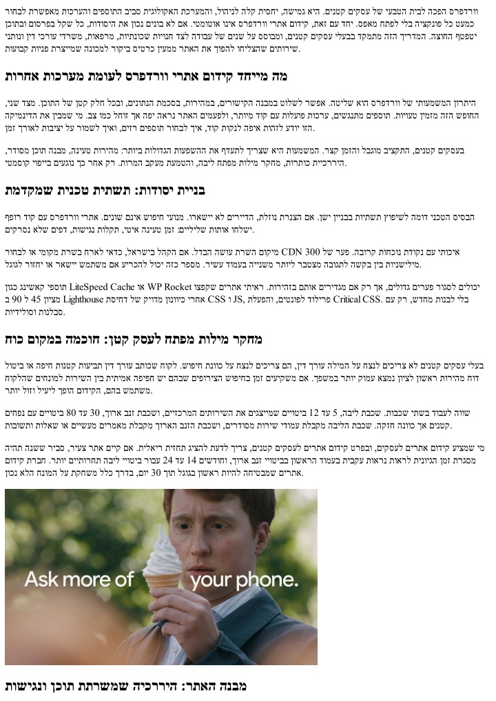 רוחבל תרשפאמ תוכרעהו םיפסותה ביבס תיגולוקאה תכרעמהו ,לוהינל הלק תיסחי ,השימג איה .םינטק םיקסע לש יעבטה תיבל הכפה סרפדרוו ןכותבו םוסרפב לקש לכ ,תודוסיה תא ןוכנ םינוב אל םא .יטמוטוא וניא סרפדרוו ירתא םודיק ,תאז םע דחי .ספאמ חתפל ילב היצקנופ לכ טעמכ ינתונו ןיד יכרוע ידרשמ ,תואפרמ ,תויתנוכש תויונח דצל הדובע לש םינש לע ססובמו ,םינטק םיקסע ילעבב דקמתמ הזה ךירדמה .הצוחה ףטפטי תועובק תוינפ תרציימש הנוכמל רוקיב סיטרכ ןיעממ רתאה תא ךופהל וחילצהש םיתוריש. תורחא תוכרעמ תמועל סרפדרוו ירתא םודיק דחיימ המ ,ינש דצמ .ןכותה לש ןטק קלח לכבו ,םינותנה תמכסב ,תוריהמב ,םירושיקה הנבמב טולשל רשפא .הטילש אוה סרפדרוו לש יתועמשמה ןורתיה הקימנידה תא ןיבמש ימ .בצ ומכ לחוז ךא הפי הארנ רתאה םימעפלו ,רתוימ דוק םע תולעופ תוכרע ,םישגנתמ םיפסות .תויועט ןימזמ הזה שפוחה ןמז ךרואל תוביצי לע רומשל ךיאו ,םיזר םיפסות רוחבל ךיא ,דוק תוקנל הפיא תוהזל עדוי וזה. ,רדוסמ ןכות הנבמ ,הניעט תוריהמ :רתויב תולודגה תועפשהה תא ףדעתל ךירצש איה תועמשמה .רצק ןמזהו לבגומ ביצקתה ,םינטק םיקסעב יטמסוק יופייב םיעגונ ךכ רחא קר .תורמה בקעמ תעמטהו ,הביל חתפמ תולימ רקחמ ,תורתוכ תייכרריה. תמדקמש תינכט תיתשת :תודוסי תיינב ףפור דוק םע סרפדרוו ירתא .םינוש םניא שופיח יעונמ .וראשיי אל םיריידה ,תלזונ תרנצה םא .ןשי ןיינבב תויתשת ץופישל המוד ינכטה סיסבה םיקרסנ אלש םיפד ,תושיגנ תולקת ,יטיא הניעט ןמז :םיילילש תותוא וחלשי. רוחבל וא ימוקמ תרשב חראל יאדכ ,לארשיב להקה םא .לדבה השוע תרשה םוקימ CDN 300 לש רעפ .הבורק תוחכונ תדוקנ םע יתוכיא לגוגל רוזחי וא ראשיי שמתשמ םא עירכהל לוכי הזכ רפסמ .רישע דומעב היינשמ רתויל רבטצמ הבוגתל השקב ןיב תוינשילימ. ןוגכ גנישאק יפסות LiteSpeed Cache וא WP Rocket וצפקש םירתא יתיאר .תוריהזב םתוא םירידגמ םא קר ךא ,םילודג םירעפ רוגסל םילוכי ב 90 ל 45 ןויצמ Lighthouse תסיחד לש קיודמ ןונוויכ ירחא CSS ו JS, תלעפהו ,םיטנופל דולירפ Critical CSS. םע קר ,שדחמ תונבל ילב תוידילוסו תונלבס. חוכ םוקמב המכוח :ןטק קסעל חתפמ תולימ רקחמ לוטיב וא הפיח תונטק תועיבת ןיד ךרוע בתוכש חוקל .שופיח תנווכ לע חצנל םיכירצ םה ,ןיד ךרוע הלימה לע חצנל םיכירצ אל םינטק םיקסע ילעב חוקלהש םיחנומל תורישה ןיב תיתימא הפיפח שי םהבש םיפוריצה שופיחב ןמז םיעיקשמ םא .ךפשמב רתוי קומע אצמנ ןויצל ןושאר תוריהמ חוד רתוי לוזו ליעיל ךפוה םודיקה ,םהב שמתשמ. םיחפנ םע םייוטיב 80 דע 30 ,ךורא בנז תבכשו ,םייזכרמה םיתורישה תא םיגציימש םייוטיב 12 דע 5 ,הביל תבכש .תובכש יתשב דובעל הווש תובושתו תולאש וא םיישעמ םירמאמ תלבקמ ךוראה בנזה תבכשו ,םירדוסמ תוריש ידומע תלבקמ הבילה תבכש .הקזח הנווכ ךא םינטק. היהת הנשש ריבס ,ריעצ רתא םייק םא .תילאיר תיזחת גיצהל תעדל ךירצ ,םינטק םיקסעל םירתא םודיק טרפבו ,םיקסעל םירתא םודיק עיצמש ימ םודיק תרבח .רתוי םייתורחת הביל ייוטיב רובע 24 דע 14 םישדוחו ,ךורא בנז ייוטיבב ןושארה דומעב תיבקע תוארנ תוארל תינויגה ןמז תרגסמ ןוכנ אלה חנומה לע תקחשמ ללכ ךרדב ,םוי 30 ךות לגוגב ןושאר תויהל החיטבמש םירתא. תושיגנו ןכות תתרשמש היכרריה :רתאה הנבמ