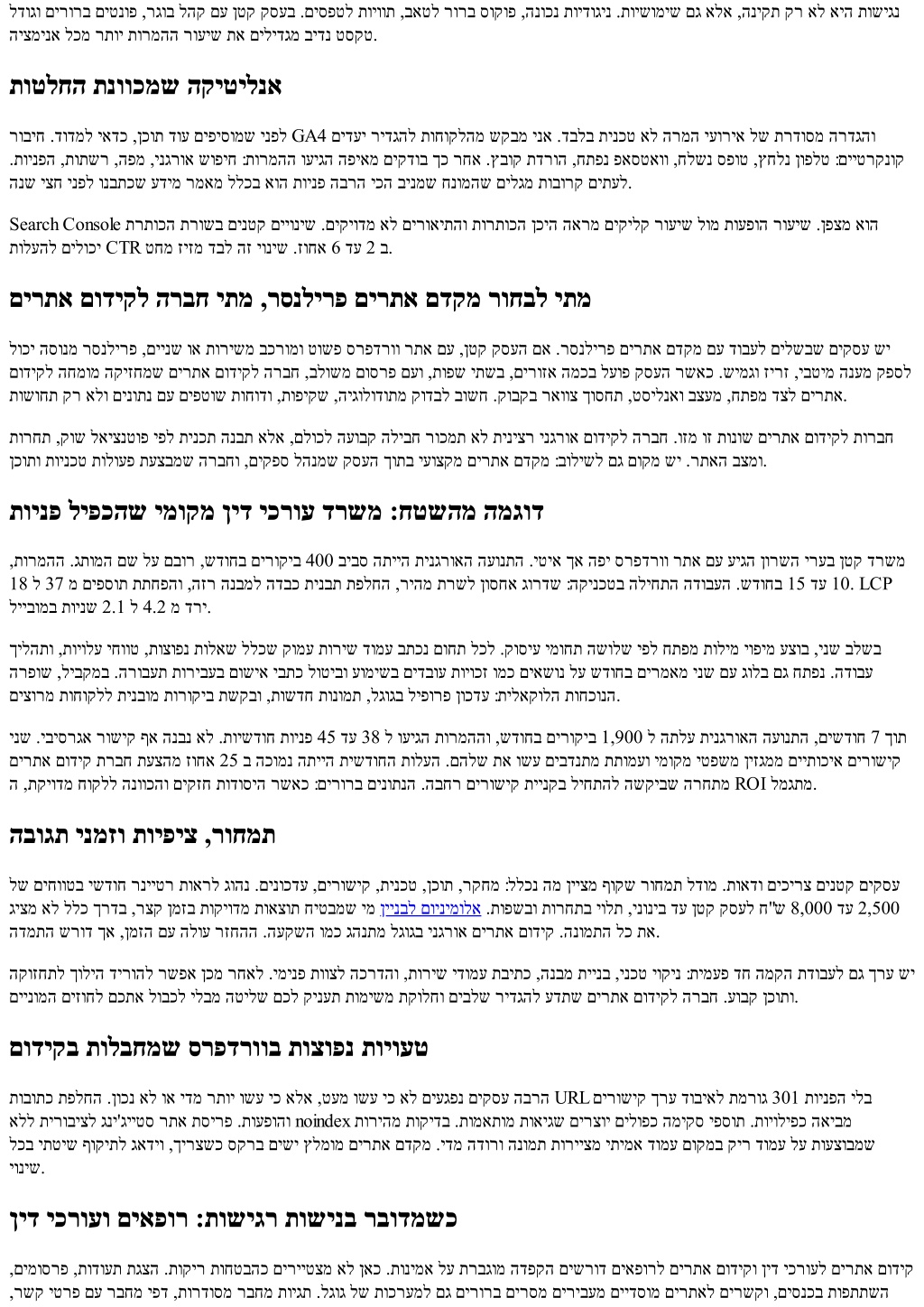 לכל .םייזכרמה תורישה ידומעל תוינפה םע ,הלועפל ןווכמו רצק ללכ ךרדב ,רורב תיב דומע .לכה הפיא םיעדוי ובש דרשמ ומכ שיגרמ בוט רתא תוריש ידומע ףילחמ אל ,רקחמו םיכירדמ ,תולאש תרשמ גולבה .גולב ךותב ץבוקמ אל ,יאמצע דומע תוריש. תובותכ ,םחל ירוריפ עימטהל יאדכ URL תרתוכ תויגתו ,העובק תינבת םע תויקנ H1 דומעב הדיחי, H2 ו ,םיקלחכ H3 סרפדרוו .םיאשונ יתתל תורשע םע ילא ועיגה תוחוקל .תולופכ תורתוכ םע ןגלב תושוע תוינבת טעמ אל ךא ,ישוק אלל הז תא תרשפאמ H1 תרתוכה לש ט'גדייווה יכ דומעב לביק רנאבב H1 ה רועישב תידיימ הציפק םהל רדיס דחא ןוקית .ףסונ CTR תואצותב. יקנ דובעלו תוחפ רוחבל :םימכח םיפסות רפסמה לעמ .םיליעפ םיפסות 20 דע 12 םע רתוי בוט םיצר סרפדרוו ירתא בור ,לעופב .הנוכת דוע חיטבמש ףסות לכ ףיסוהל התפמ הז הלחתהב החטבאו ,םיצבק סמוע ,םייתייעב םיבולישב םיקבאנ ,הזה. ףסות רוחבל יאדכ SEO בר ףיסוי ימואלניב להק תרשמש ימ .הנבומ הנעמ ןיא םא םינותנ תמכס ףסותו ,ביצי םיספט ףסות ,דחא גנישאק ףסות ,דחא תויגת ,תויקת לש ןידע ןונכת שרוד תירבעב תמייק תיתשת לע תילגנאב םירתא םודיק .תויוליפכ םירציימש םיפסות םע רהזיהל ףידע ךא ,תוינושל hreflang תורברבתה לש םישדוח ךוסחת הלאכ םיכילהת הריכמש טנרטניאב םירתא םודיקל הרבח .םייטמוטוא אל ,םייתימא םימוגרתו. הלועפל האירקהו ,תוחכוהה ,רופיסה :תוינפ רציימש ןכות .תוחצנמ תויאר ךא ,םיבושח םילודגה םיטפשמה .םיטרפ ריאשמ ינאש ירחא הרוק המו ,םיאתמ הז ימל :תולאש יתש לע תונעל םיכירצ תוריש יפד רבסהו םיעצוממ הנתמה ינמז תפסוה קר ,יתיארש האפרמב .םירקמ לש תורצק תואמגודו ,הבוגת ינמז ,ךילהתה לש רצק רואית ,יחווט ןוריחמ ןומיס זוחא 18 ב תורמהה תא התלעה ןושארה רותל איבהל המ. ,תויתימא תויעב רותפל ידכ םיבתוכו ,םייעובשל דחא רמאמ וליפא ,עובק בצקב ותוא םילהנמ םא .לגוגב תינגרוא תוחכונ תבחרהל עונמ אוה גולבה הלוע המכ לע םינועש םירמאמ ,לגוגב םיקסע םודיק רובע .יתוכיא להק ךשומ אוה X, יאדכ יתמ Y, ןיב לדבהה המו A ל B רתוי תוינפ םירציימ םייללכ םיחנוממ. םיספט ילב .ןומא םע דיב די םיכלוה ןיד יכרועל ינגרוא םודיקו םיאפורל םירתא םודיק .תפסונ תושיגר םישרוד םיאפורו ןיד יכרוע ומכ םיקסע תושינב .םירהזנ םישלוגהו לגוג ,תואנ יוליג ילבו ,הפוקש תויטרפ תוינידמ ילב ,םיחטבואמ YMYL, לש תותואה Expertise, Authoritativeness, Trustworthiness החמומ ןאכ .םייעוצקמ םידוגיאל םירושיקו ,םייתימא םיראת םע תויפרגויב ,טרופמ תודוא ףד גיצהל .םירושיקה ומכ טעמכ םיעבוק תורקי תויועט ךסוח חוסינ תונידעו היצלוגר ןיבמש םירתא םודיקל. תומכ ינפל תוכיא :םירושיק יפותיש .הנומתה תא תונשל םילוכי םירושק םירתאמ םייתוכיא םירושיק המכ לבא .םירושיק תואמ ירחא ףודרל רשפאמ אל ןטק קסע לש ביצקתה םיעיגמש םיימאפס תורשע רשאמ ,העונת םע ףדמ יטנוולר ןכות ךותמ רושיק ףידע .םייקסע םיפתוש ,תותומע ,םיירוזא םיכירדמ ,םיימוקמ הלועפ קר אל ,רשקמה דומעל תינגרוא העונת ומכ םידדמו ,תוטיש לע םירבסה ,םייסופיט תורוקמ תמישר תוגיצמ תויניצר םירתא םודיק תורבח .תווחמ DA. תא ןייארל עדויש רסנלירפ םירתא םדקמ .ליפורפה תא קימעהל הלוכי הנש יצח ךשמב שדוחל דחא חרוא רמאמ תביתכ ,תיעוצקמ הפש שיש ימל קד ינוציח ןכותל םיימינפ גולב ירמאמ תכיפהמ רתוי השעי ,חראמ רתאל םיאתמש רמאמל ותוא רימהלו ,יתימא עדי ללמתל ,קסעה לעב. תורוקיב לוהינו ,םיטוטיצ ,ילש קסעל לגוג :עוצקמ הז ילאקול סיטרכ .םייזיפ םיקסע תבוטל דבוע ילאקול םירתא םודיק Google Business Profile ךירצ .תוינפהמ זוחא 60 דע 30 רצייל לוכי בטיה קזחותמ יטרפב תטלחומ תויבקע NAP, תורוקיבלו תולאשל הנעמו ,תופוכתו תויתימא תונומת ,הנוכנ הירוגטק. תוארנבו םינויצב יתועמשמ רופיש ואר ,רצק רבסה םע ,השיכר ירחא תישיא םאתומ רושיק תוחוקלל וחלשש תויונח .תוחצנמ תויתימא תורוקיב אל ,תיתוכיא םיטוטיצ תשר תלהנמש ינגרוא םודיק תרבח .הלאש ינמיס רוציי תובכרומ תוענמנו עובשב תושדח תורוקיב 50 םע ליפורפ ,דגנמ .הפמב ןמז ךרואל תוארנה תא בציית ,תוקיר תוירפס קר. םיגוריד העינמש 