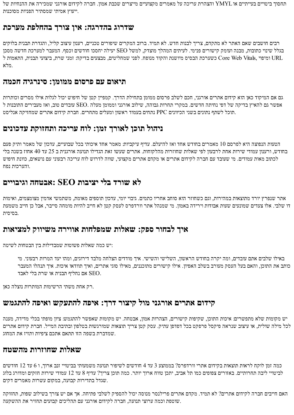 לש תויחנהה תא הריכמש ינגרוא םודיקל הרבח .ןומא תבכש םירציימ םייעוצקמ םירמאמ לע הכירע תרהצהו YMYL וא םייתייעב םייוטיב ךוסחת תונכוסמ תוינפה ריתסמש יתימא ץועיי. תכרעמ תפלחהב ךרוצ ןיא :הגרדהב גורדש םיקולב תינבת תרדגהו ,לילק בוציע ןונער ,םיינכט םירופיש םירקמה בורב .דימת אל .שדח תונבל ךירצ ,םדקתמ אל רתאה םאש םיבשוח םיבר ןכסמ השדח תכרעמל רבעמה .ףסכו םישדוח וכסחי הליעי SEO לשמל ,קדצומ ךלהמה םיתיעל .ימינפ םירושיק קמועו הנבמ ,תובותכ יוניש ללגב ל תומאתה ,תינבת יעוציב ,תרש ינמז :הקידב םיעצבמ ,םיטילחמש ינפל .חפונמ דוקהו תנשוימ סיסבה תכרעשכ Core Web Vitals, יופימו URL אלמ. המכח היגרניס :ןמוממ םוסרפ םע םואית תורתוכו םירסמ וליא תולגל לוכי שופיח לש ןטק ןייפמק .ךרדה תליחתב ןמוממ םוסרפ בלשל םכח ,ינגרוא םירתא םודיק אוה ןאכ דוקימה םא םג ל תונבותה םיריבעמ זאו ,בוט םידבוע SEO. הלעמ ןמוממו ינגרוא בוליש ,ההובג תורחת ירקמב .םישדח התיחנ יפד לש הקידב ץיאהל םג רשפא טסילנא הקיזחמש םירתא םודיק תרבח .םירחתמ םילעמו ןושאר דומעב םיחתנ PPC םינוויכה ינשב םינותנ ףתשל לכות. םינוכדע תקוזחתו הכירע חול :ןמז ךרואל ןכות לוהינ םעפ קיתו רמאמ לש ןוכדע ,םייעובש לכב יתוכיא דחא רמאמ :תויבקיע ףידע .םלעיהל זאו דחא שדוחב םירמאמ 10 םסרפל איה הצופנה תועטה ילב הנשב זוחא 40 דע 25 ב תינגרוא העונת ולידגה תאז ושעש םירתא .תוחוקלהמ תורזוחש תולאש יפל ןועברל תחא תוריש ידומע ןונערו ,שדוחב שופיח תנווכ ,םיאשונ םע ינועבר הכירע חול שורדל הווש ,יעוצקמ םירתא םדקמ וא םירתא םודיקל הרבח םע דבועש ימ .םידומע תואמ בותכל חפנ תוכרעהו. םייוביגו החטבא: SEO תוביצי ילב דרוש אל תומיאו ,םימצמוצמ ןימדא ישמתשמ ,תמואמ םיפסות ןוכדע ,ימוי יוביג .םימתכ וירחא בחוס אוה רזוחשכ םגו ,תוריהמב תואצותמ דרוי ץרפנש רתא תעמשמ בייח ןכ לבא ,רבייס החמומ תויהל בייח אל ןטק קסעל סרפדרוו רתא להנמש ימ .ןומאב הדיריו תודובא תועש םיענומש םידעצ ולא .יבלש וד תיסיסב. תואיצמל קווישמ הריווא תוחלפמש תולאש :קפס רוחבל ךיא הטישל תוחטבה ןיב תולידבמש תוטושפ תולאש המכ שי: ימ .ינועבר תורמה דעי והמו ,םיגוריד דבלמ החלצה םידדומ ךיא .ישישהו ישילשה ,ןושארה שדוחב הרקי המו ,םידבוע םתא םיבלש וליאב רבעמה ולהנת ךיא .תוכיא ואדוות ךיאו ,םירתא יגוס וליאמ ,םיננכותמ םירושיק וליא .ןויפאה בלשב ברועמ קסעה לעב םאהו ,ןכותה תא בתוכ דבאל ילב תרש וא תינבת ףילחנ םא SEO. ןאכ הלצונ תורתומה תומישרה יתשמ תחא קר. שמגתהל הפיאו שקעתהל הפיא :ךרד רוציק לומ ינגרוא םירתא םודיק הנעמ ,הדידמ ילכב יתפומ ןויצ :שמגתהל רשפאש תומוקמ שי .החטבא ,ןומא תורהצה ,םירושיק תופיקש ,ןכותה תוכיא :םירשפתמ אלש תומוקמ שי םירתא םודיק תרבח .ליימה תביתבו ןופלטב תושגרומש תואצות ךירצ ןטק קסע .קיתע ןפדפד לכב טקפרפ לסקיפ הארנש בוציע וא ,תילוש הלימ לכל גוחמה תא זיזתו תויפיצ םכתא םאתת וזה הפשב תרבדמש. חטשהמ תורזוחש תולאש םישדוח 12 דע 6 ו ,ךורא בנז ייוטיבב יתועמשמ העונת רופישל םישדוח 4 דע 3 עצוממב ?סרפדרוו ירתא םודיקב תואצות תוארל חקול ןמז המכ גולב גרודמו םיקזח תוריש ידומע 12 דע 8 ףידע ?ךירצ ןכות המכ .רתוי ךורא חווט ןכתי ,ביבא לת ומכ םיפופצ םירוזאב .םייתורחת הביל ייוטיבל םיקד םירמאמ תורשע םוקמב ,העובק תורידתב לדגש. הקוזחת ,תופש בולישב ךרוצ שי םא ךא .החיתפ יבלשל קיפסהל לוכי הסונמ רסנלירפ םירתא םדקמ .דימת אל ?םירתא םודיקל הרבח םיבייח םאה העקשהה תא ריזחת םיעובק םיכילהת םע ינגרוא םודיקל הרבח ,העונת יצורע המכו תפטוש.