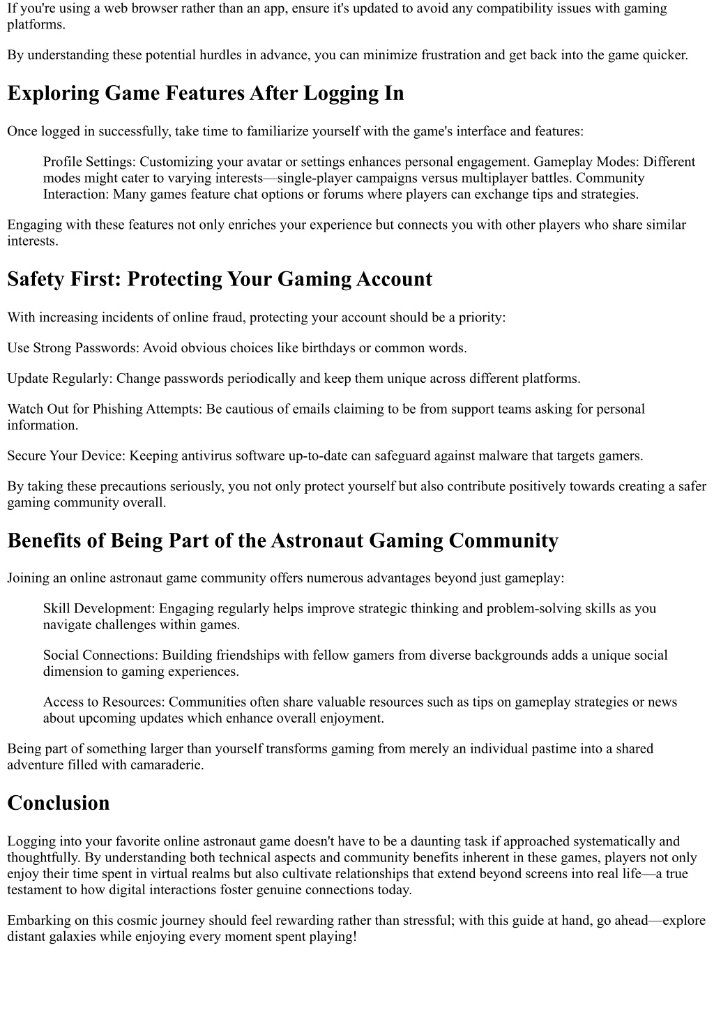 If you're using a web browser rather than an app, ensure it's updated to avoid any compatibility issues with gaming platforms. By understanding these potential hurdles in advance, you can minimize frustration and get back into the game quicker. Exploring Game Features After Logging In Once logged in successfully, take time to familiarize yourself with the game's interface and features: Profile Settings: Customizing your avatar or settings enhances personal engagement. Gameplay Modes: Different modes might cater to varying interests—single-player campaigns versus multiplayer battles. Community Interaction: Many games feature chat options or forums where players can exchange tips and strategies. Engaging with these features not only enriches your experience but connects you with other players who share similar interests. Safety First: Protecting Your Gaming Account With increasing incidents of online fraud, protecting your account should be a priority: Use Strong Passwords: Avoid obvious choices like birthdays or common words. Update Regularly: Change passwords periodically and keep them unique across different platforms. Watch Out for Phishing Attempts: Be cautious of emails claiming to be from support teams asking for personal information. Secure Your Device: Keeping antivirus software up-to-date can safeguard against malware that targets gamers. By taking these precautions seriously, you not only protect yourself but also contribute positively towards creating a safer gaming community overall. Benefits of Being Part of the Astronaut Gaming Community Joining an online astronaut game community offers numerous advantages beyond just gameplay: Skill Development: Engaging regularly helps improve strategic thinking and problem-solving skills as you navigate challenges within games. Social Connections: Building friendships with fellow gamers from diverse backgrounds adds a unique social dimension to gaming experiences. Access to Resources: Communities often share valuable resources such as tips on gameplay strategies or news about upcoming updates which enhance overall enjoyment. Being part of something larger than yourself transforms gaming from merely an individual pastime into a shared adventure filled with camaraderie. Conclusion Logging into your favorite online astronaut game doesn't have to be a daunting task if approached systematically and thoughtfully. By understanding both technical aspects and community benefits inherent in these games, players not only enjoy their time spent in virtual realms but also cultivate relationships that extend beyond screens into real life—a true testament to how digital interactions foster genuine connections today. Embarking on this cosmic journey should feel rewarding rather than stressful; with this guide at hand, go ahead—explore distant galaxies while enjoying every moment spent playing!