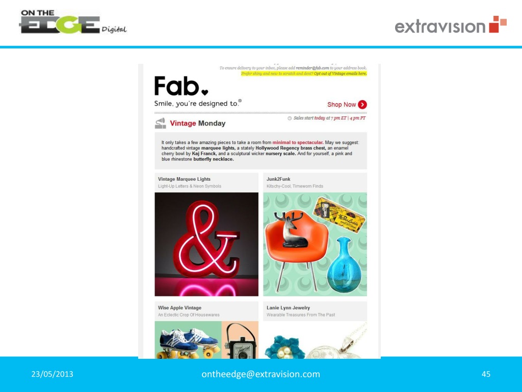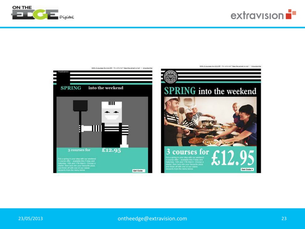 Subject lines • Special characters in subject lines http://en.wikipedia.org/wiki/Miscellaneous_Symbols • Don’t be afraid to use • FREE, OFFER, Capitalisation etc. • Hashtag in subject line ? ontheedge@extravision.com