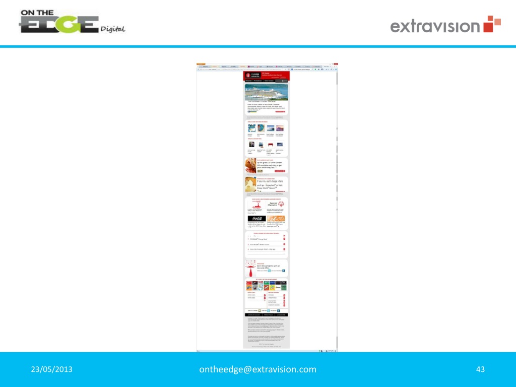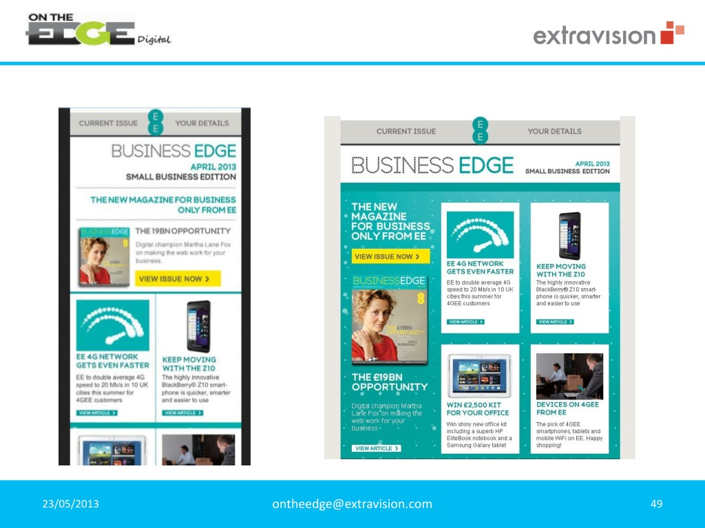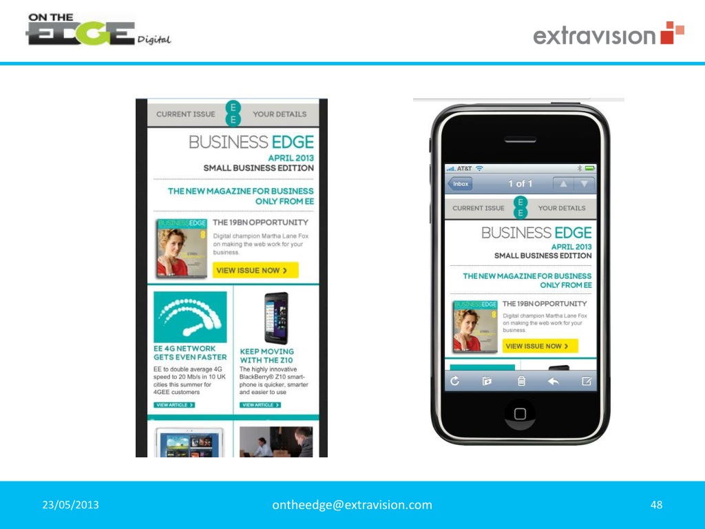 Email design for mobile • “80% of people will delete an email on a mobile device if it doesn’t look good” http://www.bluehornet.com/news/full/new-survey-reveals-shifting-consumer-views-on-email-marketing • The question was ““If you get a mobile email that doesn’t look good then what do you do ?” ontheedge@extravision.com