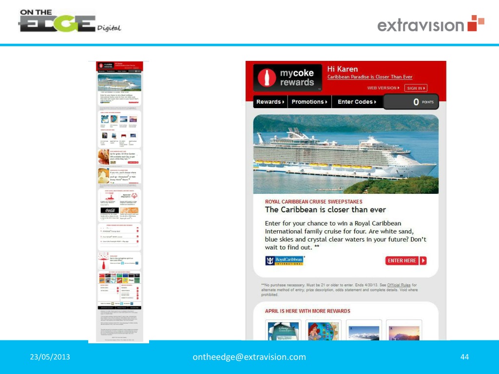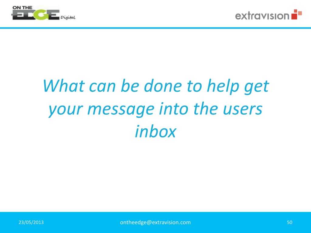 What we will cover • How to improve your data acquisition and make sure you’re legal at the same time • Ideas that can help your campaigns create more impact across all devices • What can be done to help get your message into the users inbox • Which stats are important and how successful has your campaign really been ontheedge@extravision.com