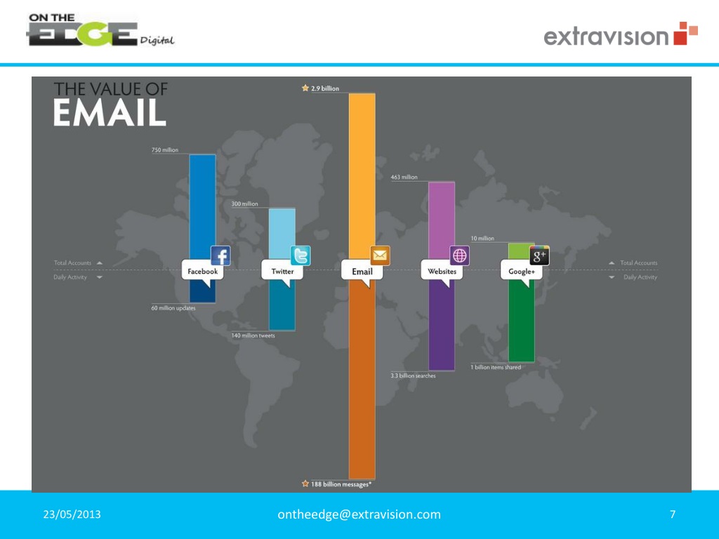 Why email marketing ? • 188 billion emails sent per day worldwide (excluding 106 billion spam messages) August 2011 • 140 million tweets – 0.74% • 60 million Facebook updates – 0.03% http://blogs.smartertools.com/2011/08/29/the-value-of-email/ ontheedge@extravision.com