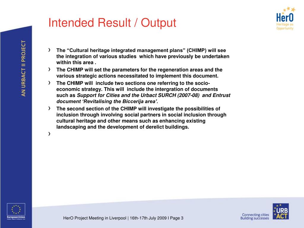 Questions to the partners in support of the elaboration of the CHIMP / integrating the LSG (IMPORT HERE FOR LAG GROUP) • What level is the CHIMP elaborating the assessment and evaluation of the area prior to the essential development of objectives and actions? • Will the CHIMP be fully entrenched in the Municipality / Local Council priorities and Budgets? • What targets is the CHIMP addressing – Is it solely objectives based on Priority Axis Objectives on a regional/city level or are there other possible aims and project parameters which go beyond OP Budget definitions. HerO Project Meeting in Liverpool | 16th-17th July 2009 I Page 15
