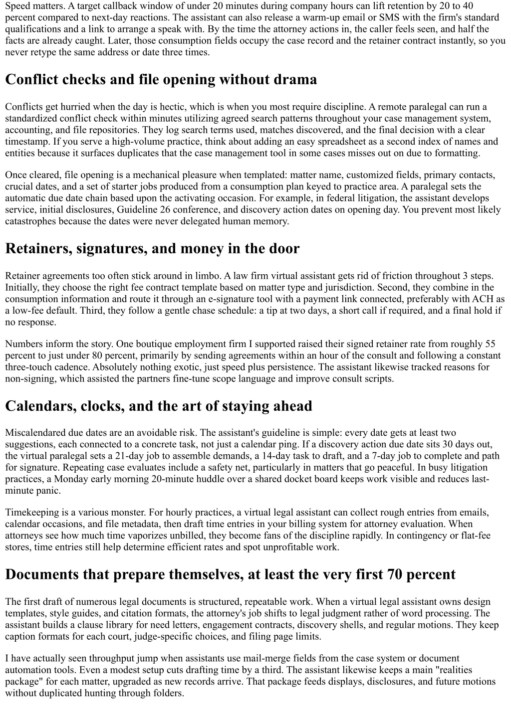 Speed matters. A target callback window of under 20 minutes during company hours can lift retention by 20 to 40 percent compared to next-day reactions. The assistant can also release a warm-up email or SMS with the firm's standard qualifications and a link to arrange a speak with. By the time the attorney actions in, the caller feels seen, and half the facts are already caught. Later, those consumption fields occupy the case record and the retainer contract instantly, so you never retype the same address or date three times. Conflict checks and file opening without drama Conflicts get hurried when the day is hectic, which is when you most require discipline. A remote paralegal can run a standardized conflict check within minutes utilizing agreed search patterns throughout your case management system, accounting, and file repositories. They log search terms used, matches discovered, and the final decision with a clear timestamp. If you serve a high-volume practice, think about adding an easy spreadsheet as a second index of names and entities because it surfaces duplicates that the case management tool in some cases misses out on due to formatting. Once cleared, file opening is a mechanical pleasure when templated: matter name, customized fields, primary contacts, crucial dates, and a set of starter jobs produced from a consumption plan keyed to practice area. A paralegal sets the automatic due date chain based upon the activating occasion. For example, in federal litigation, the assistant develops service, initial disclosures, Guideline 26 conference, and discovery action dates on opening day. You prevent most likely catastrophes because the dates were never delegated human memory. Retainers, signatures, and money in the door Retainer agreements too often stick around in limbo. A law firm virtual assistant gets rid of friction throughout 3 steps. Initially, they choose the right fee contract template based on matter type and jurisdiction. Second, they combine in the consumption information and route it through an e-signature tool with a payment link connected, preferably with ACH as a low-fee default. Third, they follow a gentle chase schedule: a tip at two days, a short call if required, and a final hold if no response. Numbers inform the story. One boutique employment firm I supported raised their signed retainer rate from roughly 55 percent to just under 80 percent, primarily by sending agreements within an hour of the consult and following a constant three-touch cadence. Absolutely nothing exotic, just speed plus persistence. The assistant likewise tracked reasons for non-signing, which assisted the partners fine-tune scope language and improve consult scripts. Calendars, clocks, and the art of staying ahead Miscalendared due dates are an avoidable risk. The assistant's guideline is simple: every date gets at least two suggestions, each connected to a concrete task, not just a calendar ping. If a discovery action due date sits 30 days out, the virtual paralegal sets a 21-day job to assemble demands, a 14-day task to draft, and a 7-day job to complete and path for signature. Repeating case evaluates include a safety net, particularly in matters that go peaceful. In busy litigation practices, a Monday early morning 20-minute huddle over a shared docket board keeps work visible and reduces last- minute panic. Timekeeping is a various monster. For hourly practices, a virtual legal assistant can collect rough entries from emails, calendar occasions, and file metadata, then draft time entries in your billing system for attorney evaluation. When attorneys see how much time vaporizes unbilled, they become fans of the discipline rapidly. In contingency or flat-fee stores, time entries still help determine efficient rates and spot unprofitable work. Documents that prepare themselves, at least the very first 70 percent The first draft of numerous legal documents is structured, repeatable work. When a virtual legal assistant owns design templates, style guides, and citation formats, the attorney's job shifts to legal judgment rather of word processing. The assistant builds a clause library for need letters, engagement contracts, discovery shells, and regular motions. They keep caption formats for each court, judge-specific choices, and filing page limits. I have actually seen throughput jump when assistants use mail-merge fields from the case system or document automation tools. Even a modest setup cuts drafting time by a third. The assistant likewise keeps a main "realities package" for each matter, upgraded as new records arrive. That package feeds displays, disclosures, and future motions without duplicated hunting through folders.