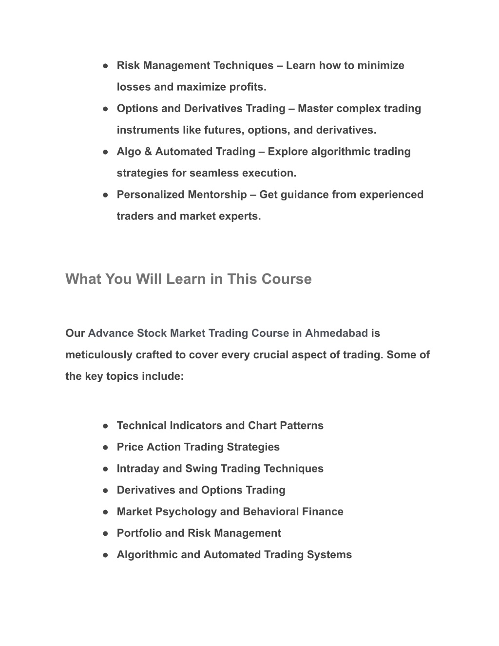 ● Risk Management Techniques – Learn how to minimize losses and maximize profits. ● Options and Derivatives Trading – Master complex trading instruments like futures, options, and derivatives. ● Algo & Automated Trading – Explore algorithmic trading strategies for seamless execution. ● Personalized Mentorship – Get guidance from experienced traders and market experts. What You Will Learn in This Course Our Advance Stock Market Trading Course in Ahmedabad is meticulously crafted to cover every crucial aspect of trading. Some of the key topics include: ● Technical Indicators and Chart Patterns ● Price Action Trading Strategies ● Intraday and Swing Trading Techniques ● Derivatives and Options Trading ● Market Psychology and Behavioral Finance ● Portfolio and Risk Management ● Algorithmic and Automated Trading Systems