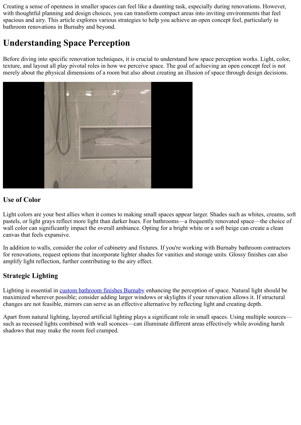 Creating a sense of openness in smaller spaces can feel like a daunting task, especially during renovations. However, with thoughtful planning and design choices, you can transform compact areas into inviting environments that feel spacious and airy. This article explores various strategies to help you achieve an open concept feel, particularly in bathroom renovations in Burnaby and beyond. Understanding Space Perception Before diving into specific renovation techniques, it is crucial to understand how space perception works. Light, color, texture, and layout all play pivotal roles in how we perceive space. The goal of achieving an open concept feel is not merely about the physical dimensions of a room but also about creating an illusion of space through design decisions. Use of Color Light colors are your best allies when it comes to making small spaces appear larger. Shades such as whites, creams, soft pastels, or light grays reflect more light than darker hues. For bathrooms—a frequently renovated space—the choice of wall color can significantly impact the overall ambiance. Opting for a bright white or a soft beige can create a clean canvas that feels expansive. In addition to walls, consider the color of cabinetry and fixtures. If you're working with Burnaby bathroom contractors for renovations, request options that incorporate lighter shades for vanities and storage units. Glossy finishes can also amplify light reflection, further contributing to the airy effect. Strategic Lighting Lighting is essential in custom bathroom finishes Burnaby enhancing the perception of space. Natural light should be maximized wherever possible; consider adding larger windows or skylights if your renovation allows it. If structural changes are not feasible, mirrors can serve as an effective alternative by reflecting light and creating depth. Apart from natural lighting, layered artificial lighting plays a significant role in small spaces. Using multiple sources— such as recessed lights combined with wall sconces—can illuminate different areas effectively while avoiding harsh shadows that may make the room feel cramped.