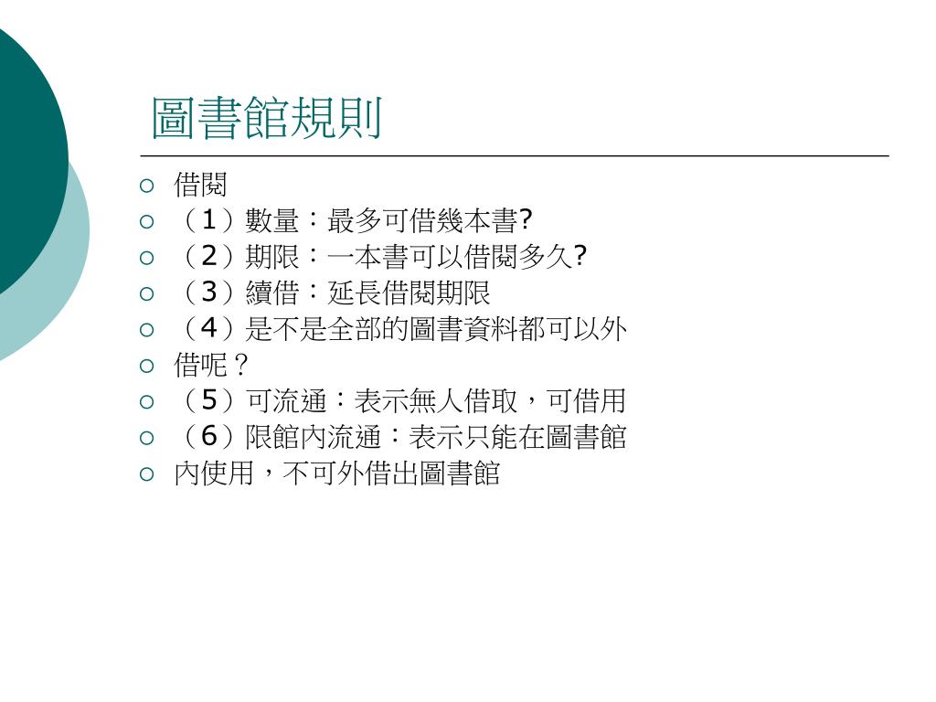 圖書館規則 • 借閱 • (1)數量:最多可借幾本書? • (2)期限:一本書可以借閱多久? • (3)續借:延長借閱期限 • (4)是不是全部的圖書資料都可以外 • 借呢? • (5)可流通:表示無人借取,可借用 • (6)限館內流通:表示只能在圖書館 • 內使用,不可外借出圖書館