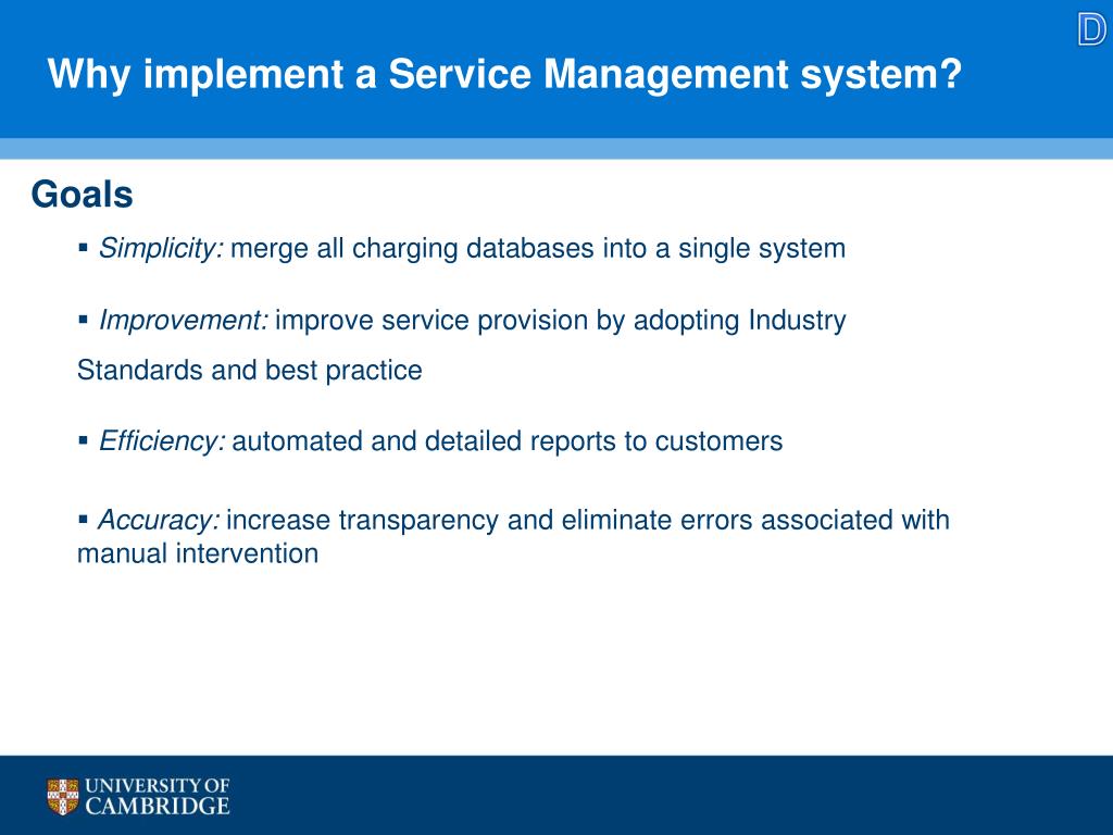 D Why implement a Service Management system? Goals • Simplicity: merge all charging databases into a single system • Improvement: improve service provision by adopting Industry Standards and best practice • Efficiency:automated and detailed reports to customers • Accuracy: increase transparency and eliminate errors associated with manual intervention