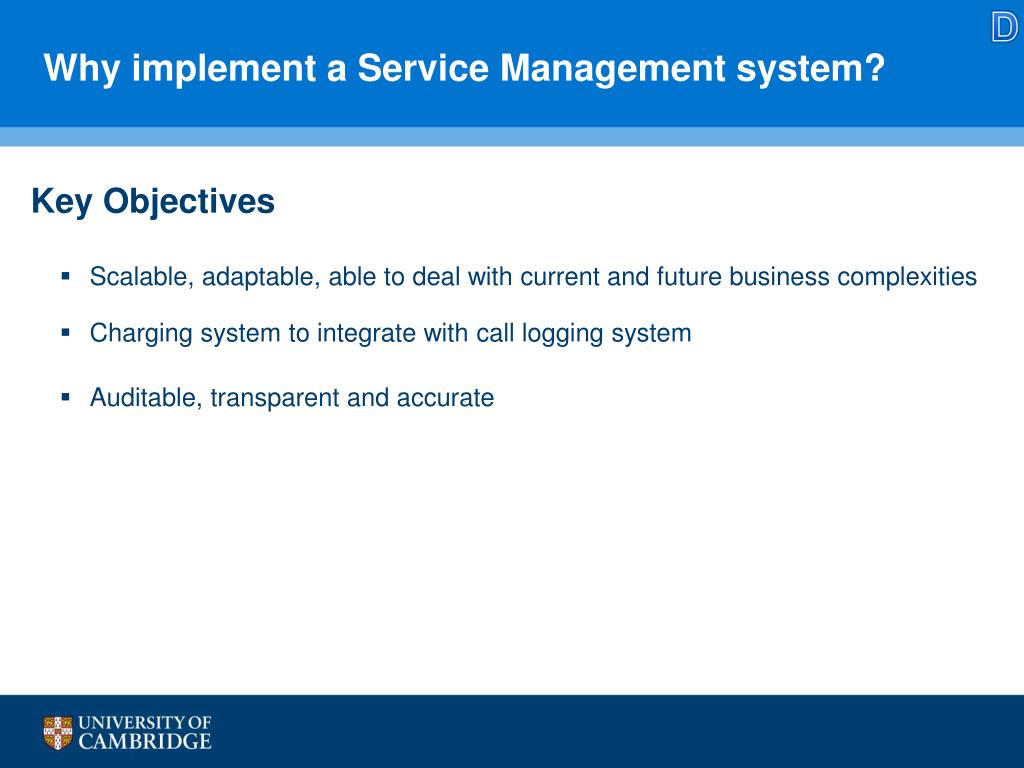 D Why implement a Service Management system? Key Objectives • Scalable, adaptable, able to deal with current and future business complexities • Charging system to integrate with call logging system • Auditable, transparent and accurate