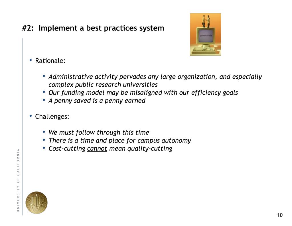 #2: Implement a best practices system • Rationale: • Administrative activity pervades any large organization, and especially complex public research universities • Our funding model may be misaligned with our efficiency goals • A penny saved is a penny earned • Challenges: • We must follow through this time • There is a time and place for campus autonomy • Cost-cutting cannot mean quality-cutting