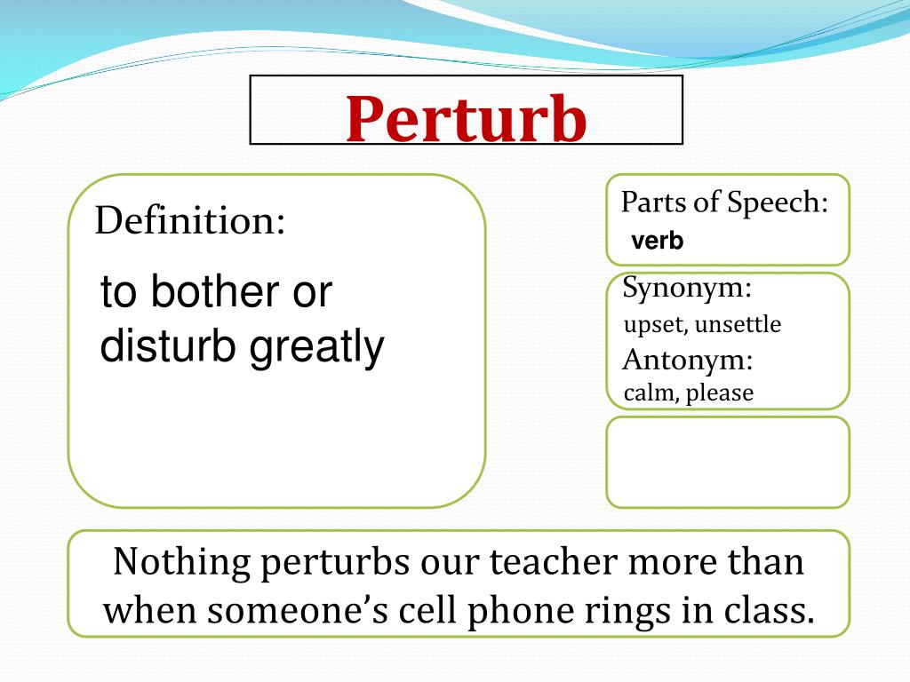 Definition: Parts of Speech: verb Perturb to bother or disturb greatly Synonym: Antonym: upset, unsettle calm, please • Nothing perturbs our teacher more than when someone’s cell phone rings in class.