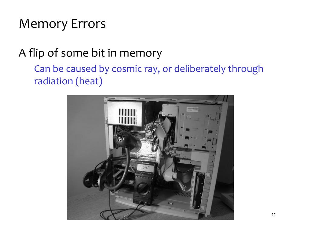 Memory Errors A flip of some bit in memory Can be caused by cosmic ray, or deliberately through radiation (heat)