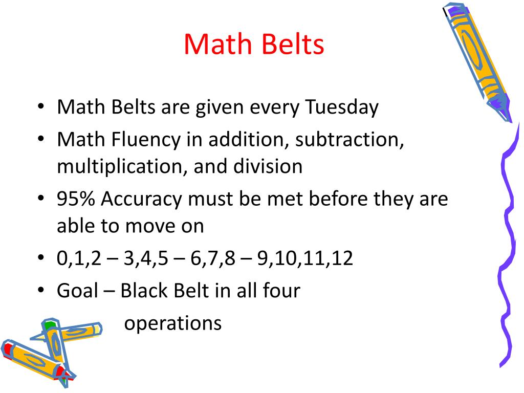 Math Belts • Math Belts are given every Tuesday • Math Fluency in addition, subtraction, multiplication, and division • 95% Accuracy must be met before they are able to move on • 0,1,2 – 3,4,5 – 6,7,8 – 9,10,11,12 • Goal – Black Belt in all four operations